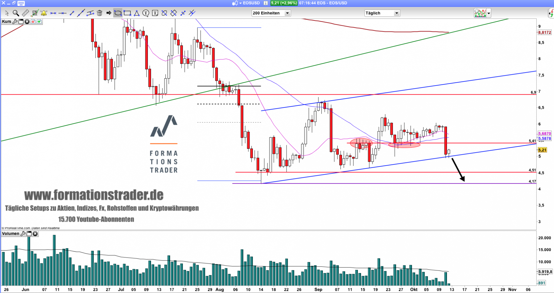 Nachdem die #Kryptowährungen in den vergangenen Tagen eine ungewohnt niedrige Volatilität aufwiesen gab es vorgestern wieder eine stärkere Bewegung. Diese führte #EOS an die untere Begrenzung der Bärenflagge bei aktuell $5.08. Bei $5.41 befindet sich eine zuletzt vom Kurs viel beachtete horizontale Linie, die nun als größerer Widerstand fungiert. Falls diese von den Bullen nicht überwunden werden kann und die Bärenflagge bärisch aufgelöst wird, ist das nächste Ziel das Jahrestief bei $4.18. Das entspricht einem Kursverlust von rund 15%, verglichen mit dem aktuellen Niveau. Erst oberhalb von $6.00 ist der Abwärtstrend vorerst egalisiert.