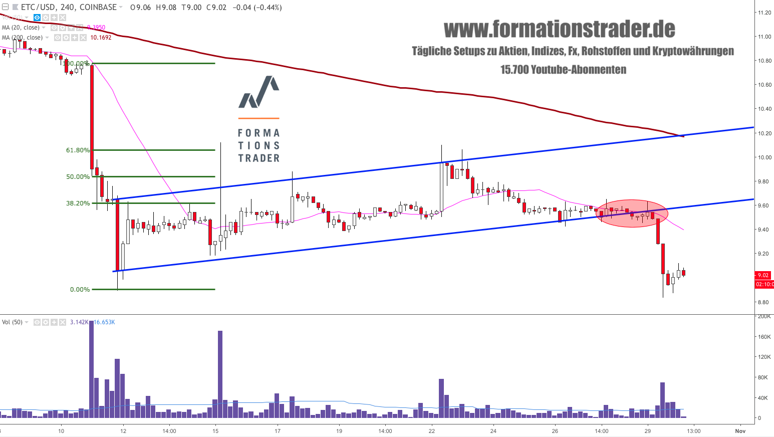 Der Kurs der #Kryptowährung Ethereum Classic zeigte in den vergangenen fünf Tagen besonders wenig Bewegung. Die Handelsspanne lag in diesem Zeitraum bei nur rund zwei Prozent. Im Vorfeld hatten wir mit unseren Klienten bereits exklusiv besprochen, dass die $10-Marke einen wichtigen Widerstand darstellt und die Wahrscheinlichkeit für einen weiteren Abverkauf bei Kursen unter $9.44 deutlich größer ist. Die $10-Marke ist nicht nur aus psychologischer Sicht wichtig. Hier verläuft auch das 61.8%-Retracement der vorangegangenen Abwärtsbewegung vom 11.10.2018 (Siehe 4-Stunden-Chart). Die anschließende Konsolidierung dieser Abwärtswelle fand gut erkennbar als Bärenflagge statt. Mit der niedrigen Volatilität in den Kryptowährungen verlief der Kurs von Ethereum Classic in den vergangenen Tagen nun sehr nahe an der unteren Begrenzung der Bärenflagge. Gestern Nacht wurde diese nun bärisch aufgelöst. Es wurde mit dem Tief bei $8.83 bereits direkt das erste Ziel von $9 abgearbeitet.