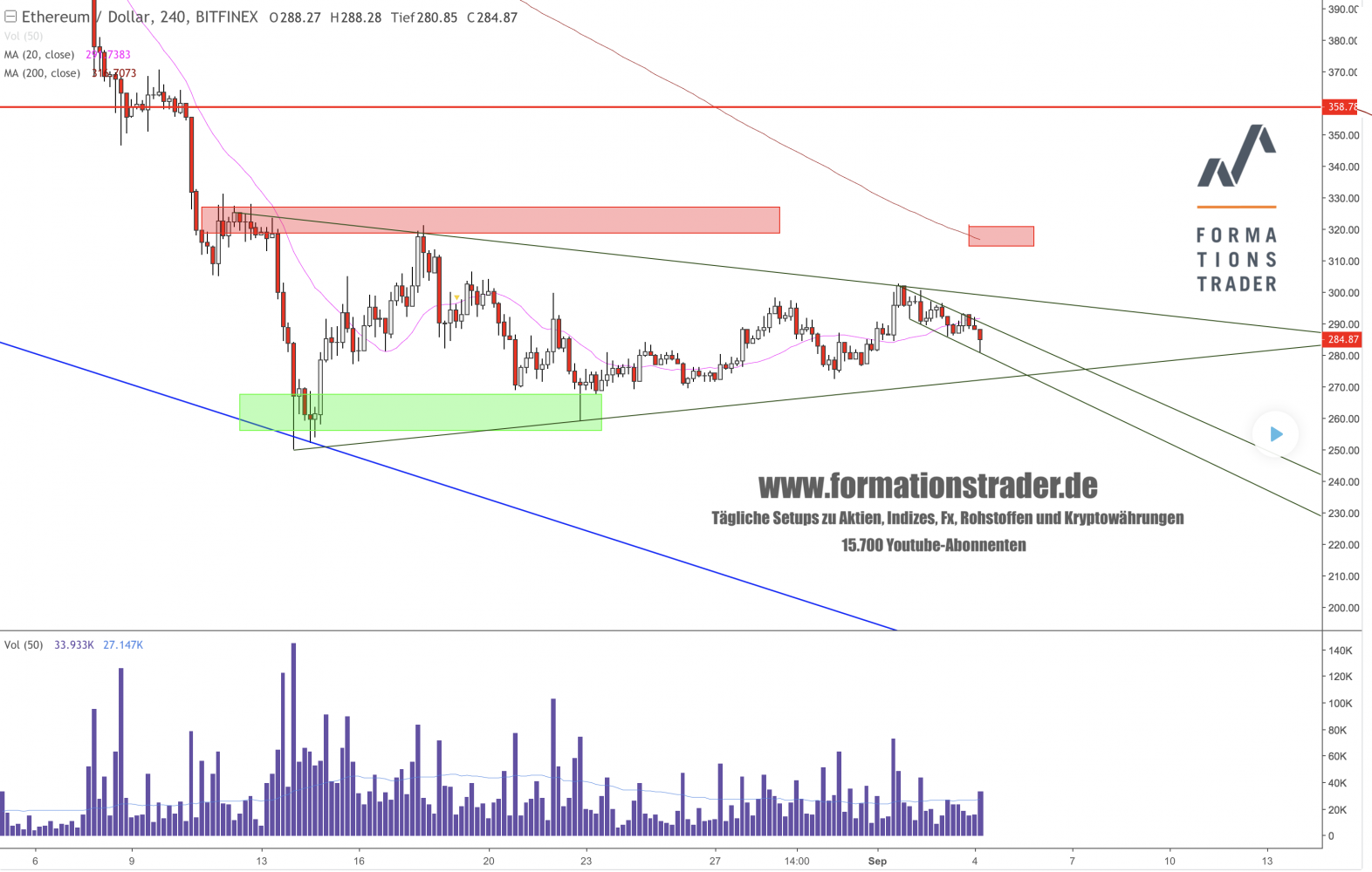 Tatsächlich hat Ethereum zwischen $268 und $270 eine klare Unterstützung gefunden und bis jetzt verteidigen können. Das erste Kursziel auf der Oberseite wurde noch nicht abgearbeitet. Im aktuellen Chartbild zeigt sich jedoch eine interessante Formation, die Kurse von $320 in naher Zukunft wahrscheinlicher macht. Im 4-Stunden-Chart bildet Ethereum ein Dreieck mit einer noch nicht aufgelösten Bullenflagge.