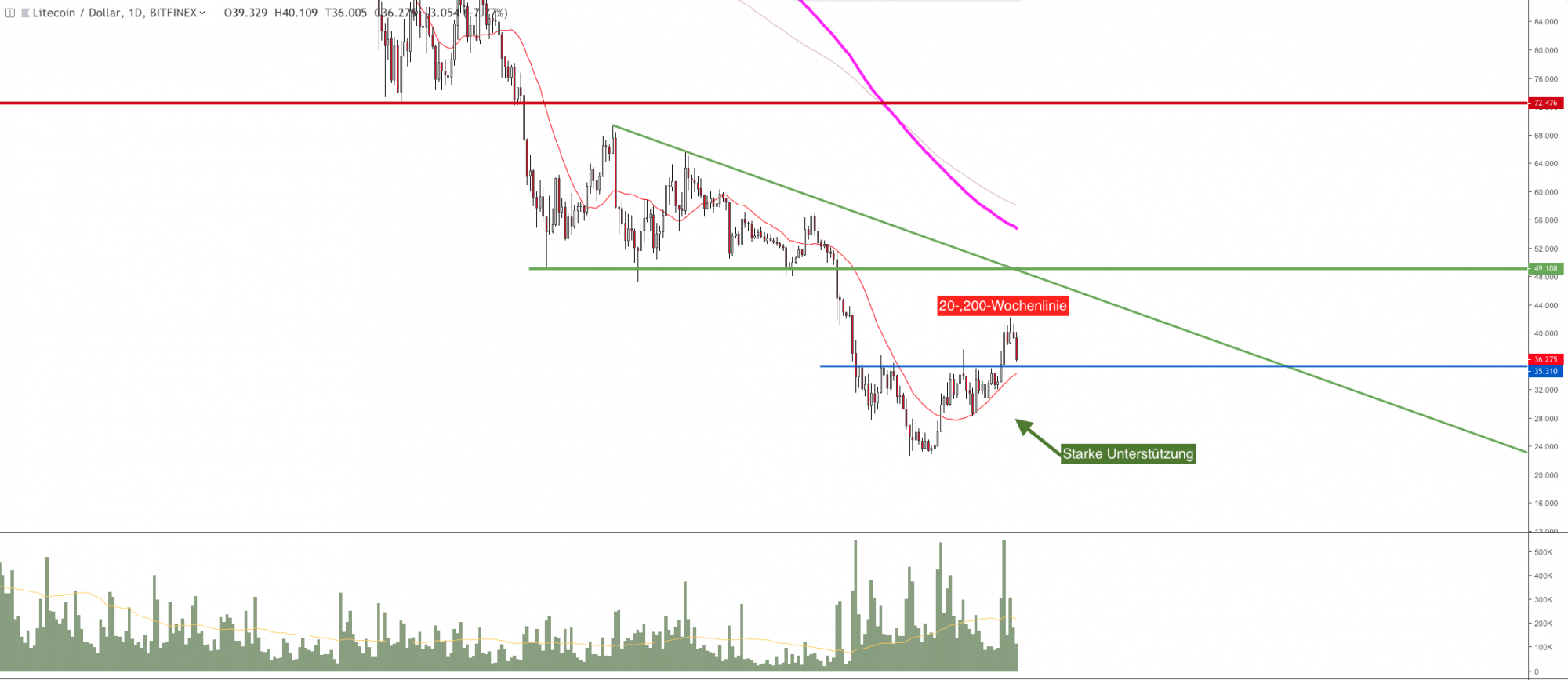 Nachdem Bitcoin die bullische Konsolidierung der letzten Tage bärisch auflöste (siehe dazu auch unsere Video-Setupanalyse zu Bitcoin), macht Litecoin einen scharfen Rücksetzer in Richtung der Nackenlinie der iSKS der letzten Tage. Hier befindet sich ebenfalls die 20-Tage-Linie als additive, technische Unterstützungsmarke. Aufgrund der Stärke der Zone, ist es eher wahrscheinlich, dass der Markt hier zunächst Unterstützung findet, was eher für Daytrader und in den kleinen Zeiteinheiten interessant ist.