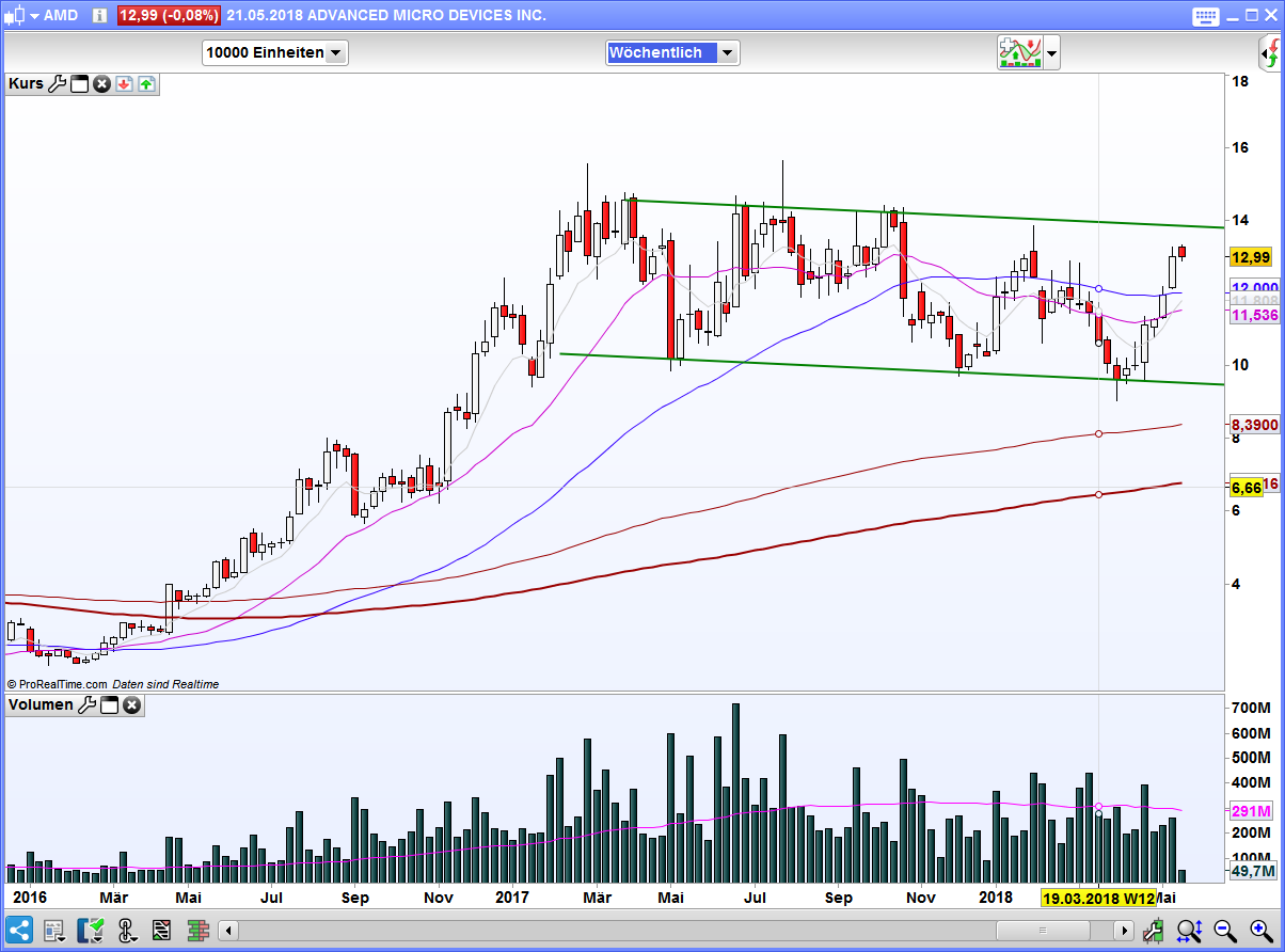 Der Chart von Advanced Micro Devises konsolidiert seit Ende Februar 2017. Im Wochenchart bildet sich eine Bullenflagge. Falls es den Bullen gelingt diese nach oben aufzulösen, sind Kurse im Bereich der 20 $ wahrscheinlicher. Für ein gutes CRV und eine höhere Wahrscheinlichkeit wäre eine mehrwöchige Seitwärtsbewegung im Bereich der oberen Flaggenbegrenzung hilfreich.