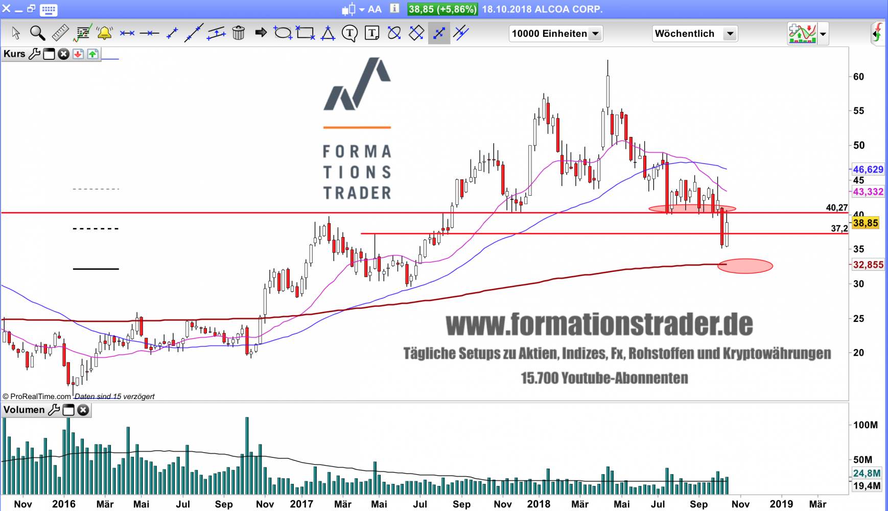 Bei den Anlegern kamen die Zahlen sehr gut an. Zwischenzeitlich betrug das Tagesplus deutlich über 10%. Der Handel schloss dann mit 5,86% Aufpreis bei $38.85. Im Wochenchart ist der Bruch der wichtigen horizontalen Linie bei $40.27 in der Vorwoche deutlich zu erkennen. Diese wurde mehrere Wochen getestet, bevor es den Bären gelang, sie nach Süden aufzulösen. Die Bullen geben sich aktuell aber noch nicht geschlagen und versuchen diese Marke nun wieder zu überwinden. Fall es ihnen mit den guten Zahlen im Rücken gelingt, einen nachhaltigen Schub zu erzeugen, sollte auch die nächste offene Kurslücke im Tageschart überwunden werden. Dies würde ein bärisches Szenario zunächst unwahrscheinlicher erscheinen lassen. Gelingt dies nicht, richtet sich der Blick auf die nächste größere Unterstützung. Diese liegt bei $32.86. Hier verläuft die 200 Tagelinie sowie, in direkter Nähe dazu das 61.8% Retracement der übergeordneten Aufwärtsbewegung.