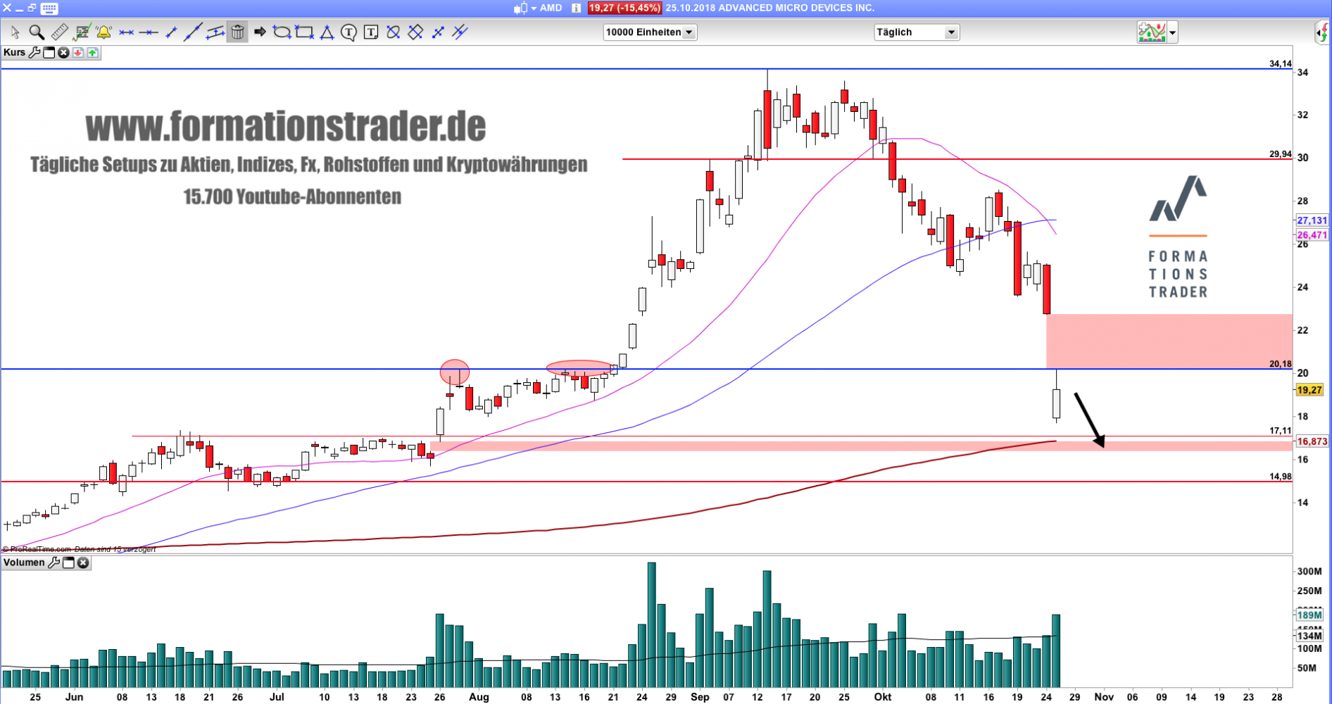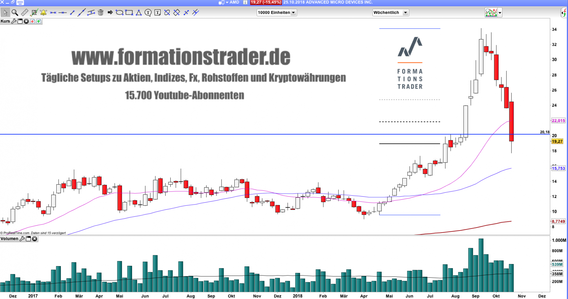 Der US-amerikanische Chipentwickler Adavanced Micro Devices berichtete am Mittwoch Nachbörslich über die Unternehmensergebnisse des abgelaufenen dritten Quartals 2018. Demnach habe man einen Gewinn in Höhe von $0.10 pro Aktie und einen Umsatz in Höhe von $1.7 Mrd. erzielen können. Im Konsens erwarteten die Analysten $0.11 pro Aktie bzw. ebenfalls $1.7 Mrd. Das Umsatzwachstum beläuft sich im Jahresvergleich auf 0.6% und damit nahezu stagnierend. Zudem prognostiziert das Unternehmen einen Gesamtumsatz für das mit Silvester endende Geschäftsjahr deutlich, welcher deutlich unter den allgemeinen Erwartungen liegt. Durchschnittlich wird mit $1.61 Mrd. gerechnet. Der aktuelle Ausblick beläuft sich auf eine Spanne zwischen $1.40 Mrd. und $1.50 Mrd.