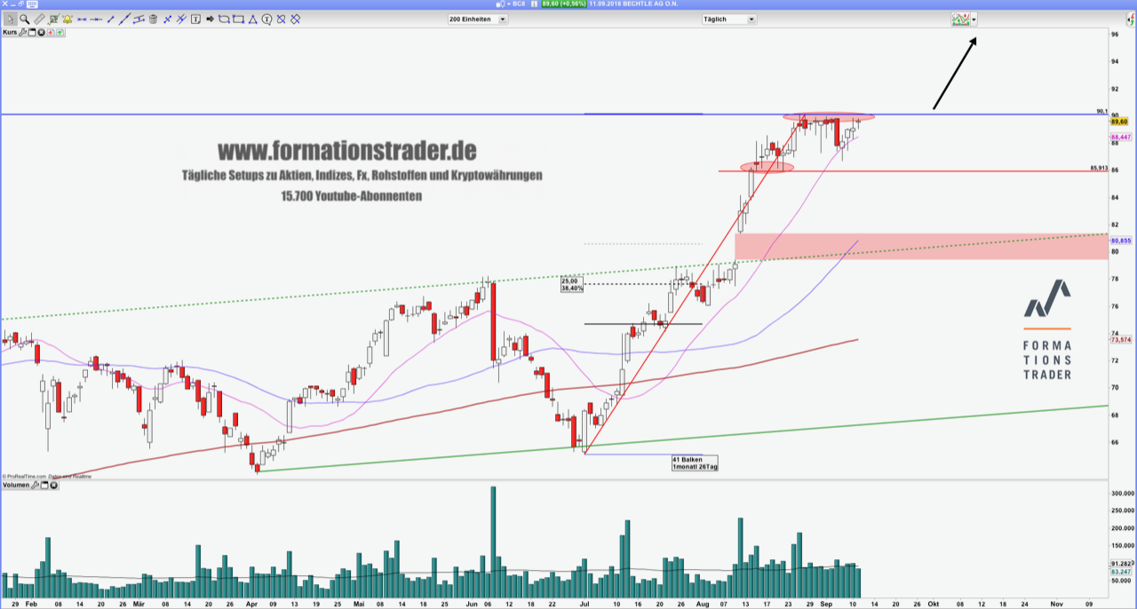 Im Chart kommen diese Meldungen sehr gut an. Auch im Nachgang der Meldungen konnte der Kurs der Aktie weiter deutlich zulegen und konsolidiert aktuell sehr eng im Bereich der 90€-Marke. Je länger diese enge Konsolidierung andauert, umso höher steigt der Druck auf das Allzeithoch. Falls dieses dann - am besten in einigen Tagen - bullisch aufgelöst wird, ist die Wahrscheinlichkeit für ein Testen der psychologisch sehr wichtigen 100€ größer. Auch ein Kursrückgang bis an die untere Begrenzung der Konsolidierung ändert zunächst nichts am mittelfristig bullischen Chartbild.