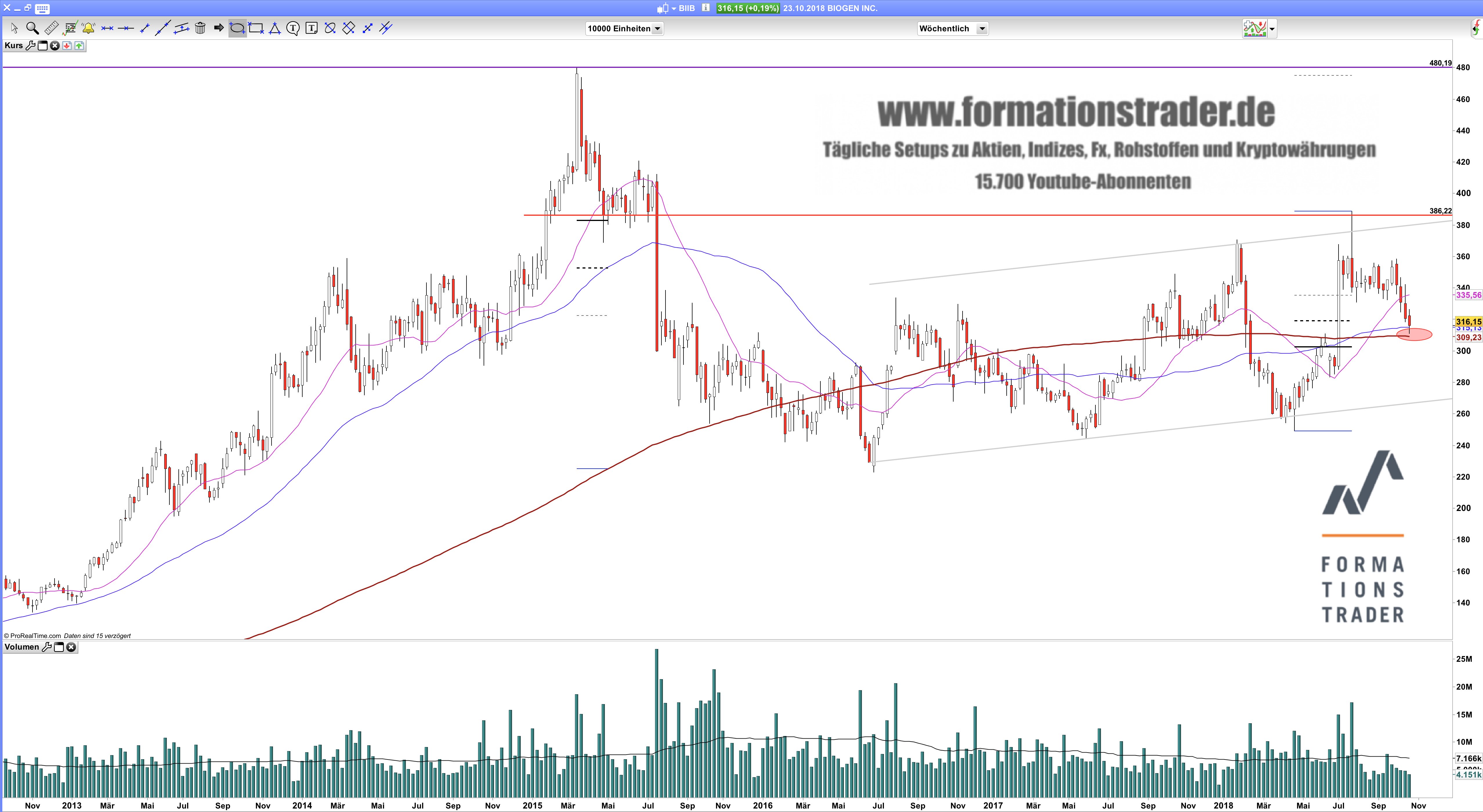 Aktuell befindet sich der Kurs von Biogen an einer wichtigen Unterstützungszone im Bereich von $309 / $313. Hier verlaufen sowohl 200-Wochen- als auch 200-Tagelinie. Darunter ist die das 61.8%-Retracement der übergeordneten Aufwärtsbewegung bei $302.70 und die psychologisch wichtige $300-Marke nicht weit entfernt. Falls es den Bullen gelingt, Kurse über $330 zu realisieren, hat die Aktie eine größere Wahrscheinlichkeit für eine Bewegung in Richtung der noch offenen Kurslücke bei rund $360. Falls die Bären sich nicht von den genannten Unterstützungen beeindrucken lassen sollten, drohen neue Abwärtswellen.