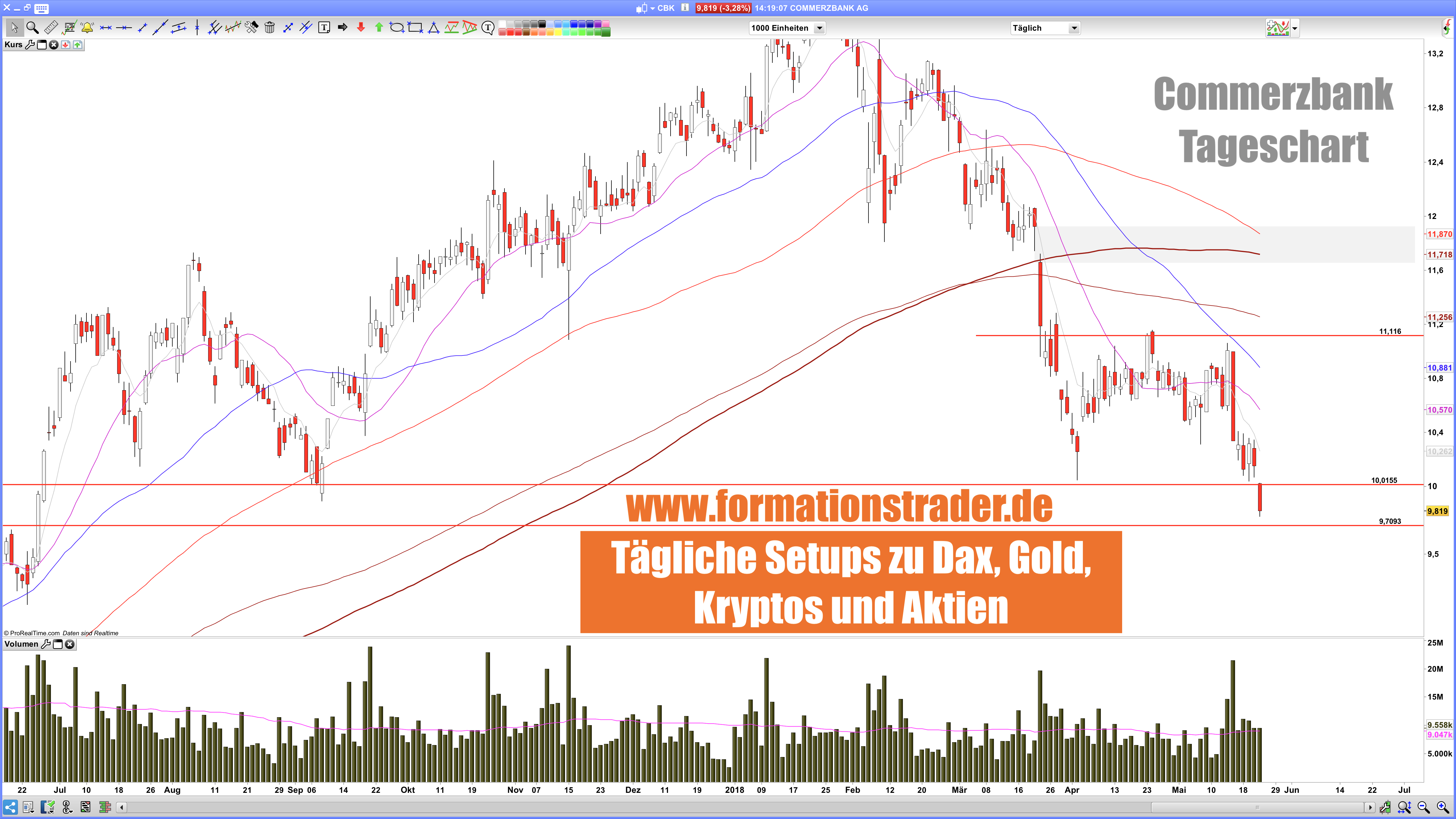 Die Commerzbank Aktie konsolidierte in den letzten Tagen knapp oberhalb der 10-Euro-Marke. Dabei bildete sich eine bärische Seitwärtskonsolidierung, was als Zeichen der Schwäche gedeutet werden musste. Heute wird diese Konsolidierung auf der Unterseite aufgelöst. Das steht sehr wahrscheinlich im starken Zusammenhang mit dem Anstieg der Renditen der italienischen Anleihen. Die Commerzbank besitzt über 14 Milliarden Euro an Staatsanleihen aus den sogenannten „europäischen Krisenländern“.