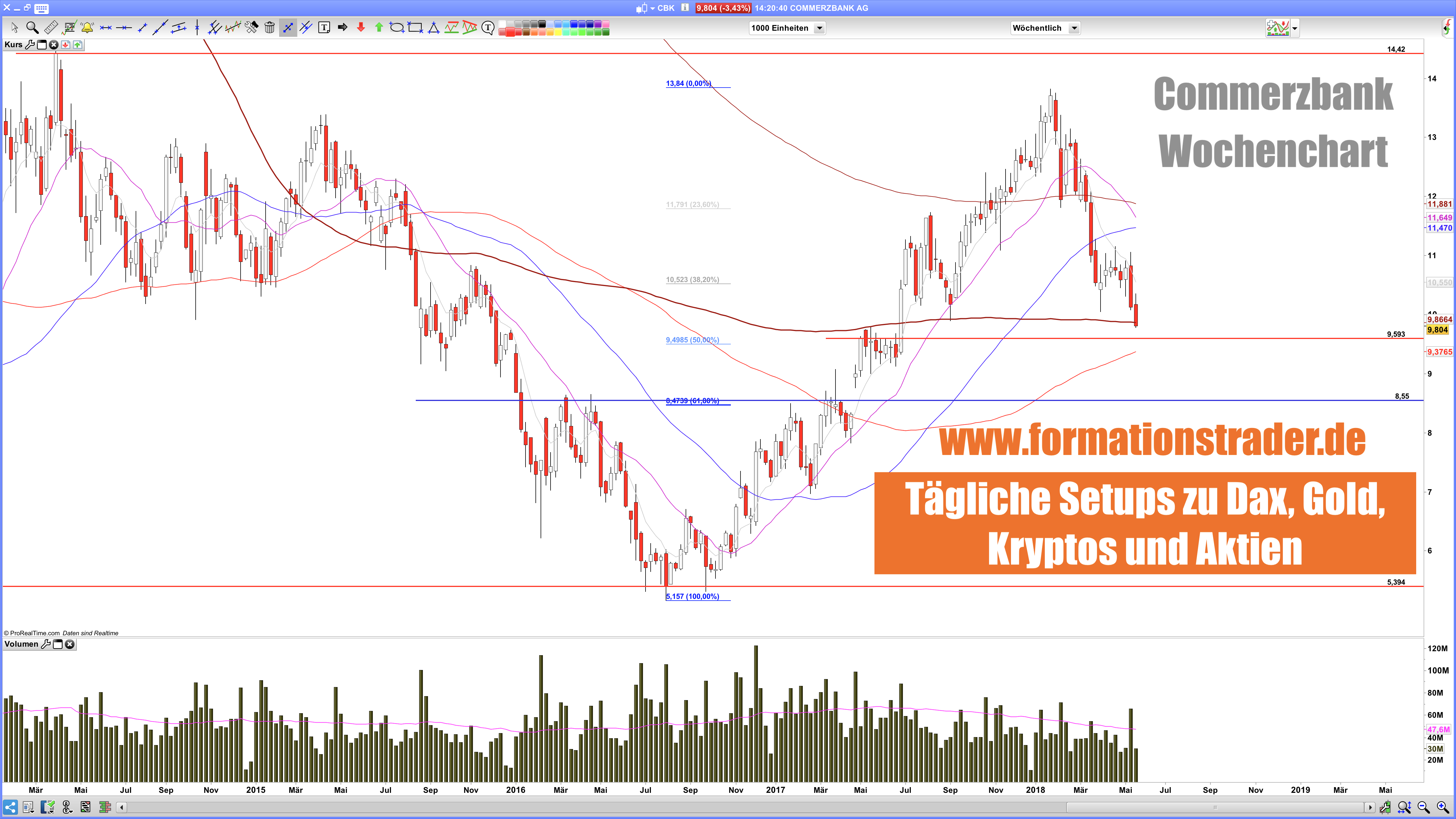 Der Rückgang des Kurses unter zehn Euro ist aus technischer Sicht als relative Schwäche zu deuten. Weitere Kursverluste erscheinen wahrscheinlich. Es gilt jedoch zu beachten, dass sich der Kurs im Bereich der wichtigen 200-Wochen-Linie befindet. Daher werde ich auf ein Trade auf der short Seite verzichten. Erst nach einer Konsolidierung um und unterhalb der oben genannten gleitenden Durchschnittslinie wäre für mich ein Set-up auf der Unterseite interessant.