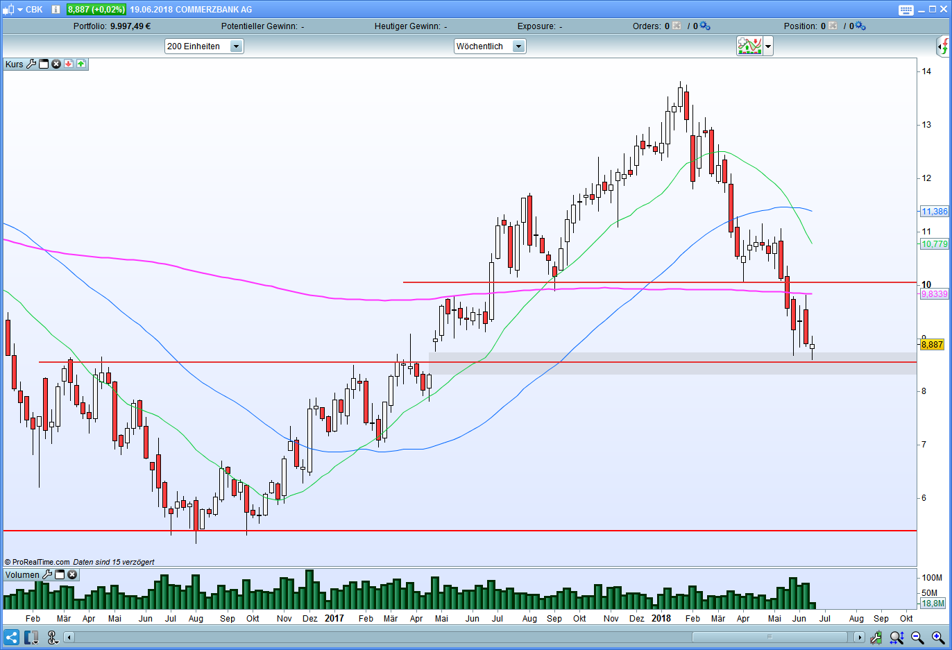 Seit Ende Januar findet bei der Commerzbank Aktie eine Korrektur statt. Der Kurs ist um 37% gefallen und trifft im Wochenchart auf eine Unterstützungszone. Diese besteht aus einer horizontalen Linie, einer offenen Lücke und dem 61,8% Retracement. Falls es den Bullen gelingt die Zone zu verteidigen, ist eine Bewegung in Richtung 200 Wochenlinie möglich.