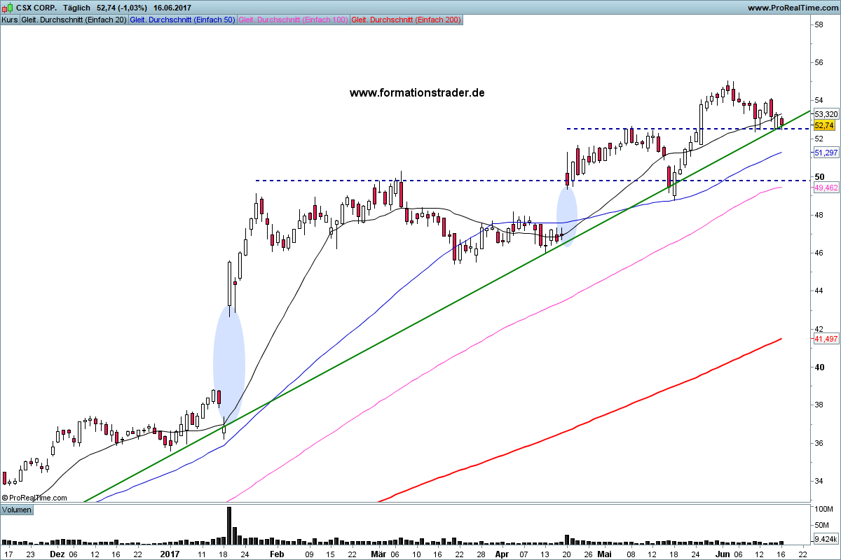 Die Aktie der CSX Corporation befindet sich in einem stabilen Aufwärtstrend und bildet ein Allzeithoch nach dem anderen. Nach dynamischen Aufwärtsbewegungen folgt eine meist nur flache Konsolidierung. Die Bullen lassen dabei keine nennenswerten Rücksetzter zu. Selbst die zwei offenen Kurslücken (blau im Chart markiert) konnten bislang nicht geschlossen werden. Dieses Gesamtbild deutet auf eine hohe relative Stärke hin.