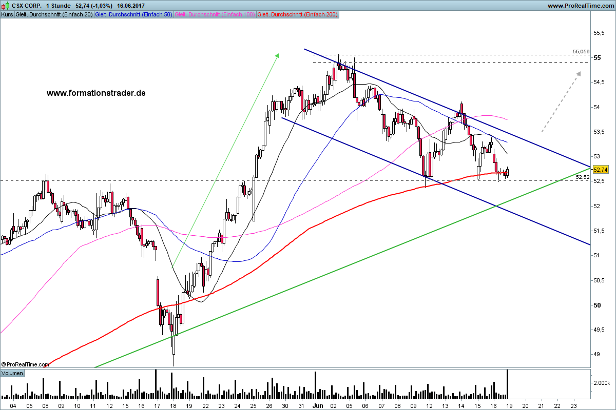 Im Stundenchart ist die letzte Aufwärtsbewegung, die ein neues Allzeithoch bei 55,05 markierte, gut zu erkennen (siehe grüner Pfeil). Aktuell konsolidiert der Wert in Form einer bullischen Flagge und testete im Rahmen eines Bull-Pullbacks nun mehrfach das ehemalige Hoch bei 52,5. Unterstützung bietet dabei die steigende 200 Stundenlinie sowie die grüne Aufwärtstrendlinie.