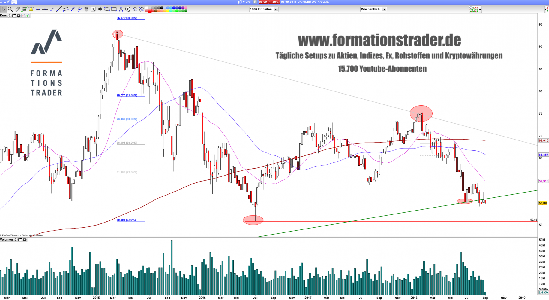 Im Tageschart ist eine deutliche Entwicklung erkennbar. So fiel der Kurs der Aktie zwischen Mai und Juli um bis zu knapp 20%. Diese Bewegung konnte bisher nur bis an das 38.2%-Retracement konsolidiert werden. Aktuell verläuft der Kurs wieder im Bereich von 55€. Falls es den Bullen nicht gelingt, den aktuellen signifikanten Tiefpunkt bei 54,18€ per Tagesschluss zu verteidigen, ergibt sich weiter bärisches Potenzial bis an die runde 50€-Marke. Bei 50,53€ befindet sich zudem der Tiefpunkt aus dem Jahr 2016, welcher bis heute nicht mehr berührt wurde.