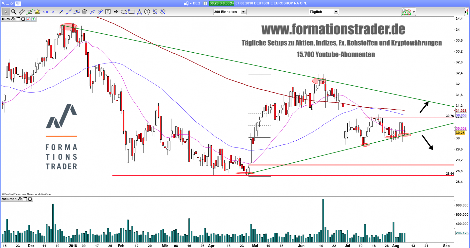 Aktuell klammert sich der Kurs der #Aktie an eine aufsteigende Trendlinie im Tageschart und verläuft sehr nahe des 61.8%-Retracements der Aufwärtsbewegung zwischen Mai und Juli (30,04€) und der psychologisch wichtigen 30€-Marke.