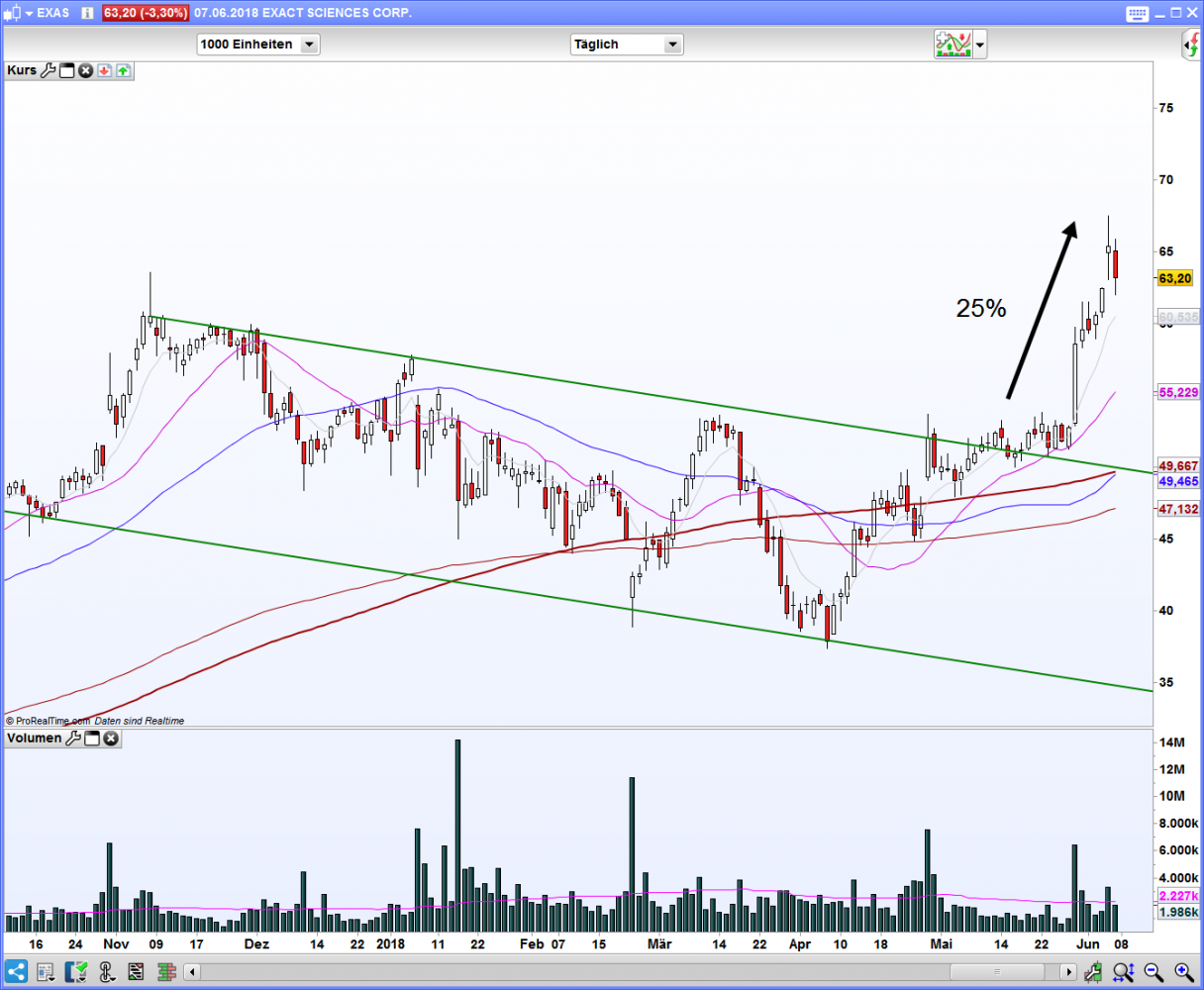 Ende Mai hatte ich Exact Sciences Corp. vorgestellt. Seitdem ist der Wert in der Spitze um 25% gestiegen.