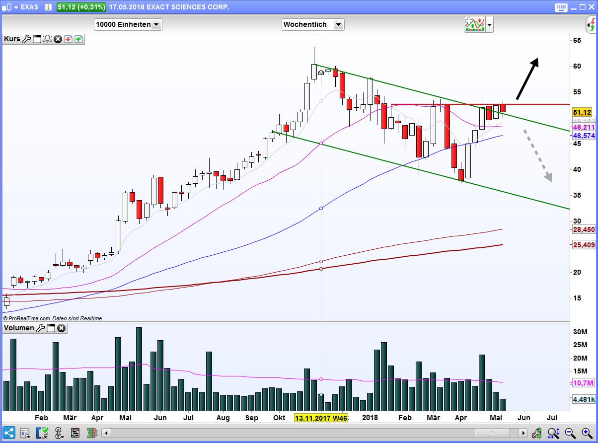 Seit dem Allzeithoch im November konsolidiert Exact Scienses. Im Wochenchart hat sich eine Bullenflagge gebildet. Die obere Begrenzung der Flagge (grüne Linie) haben die Bullen bereits überwunden.