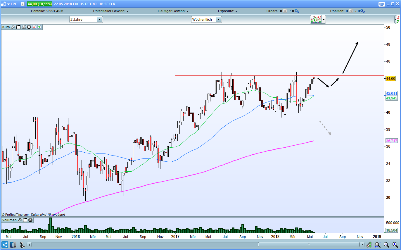 Fuchs Petrolub läuft seit einem Jahr seitwärts. Im Wochenchart hat sich eine Range gebildet.