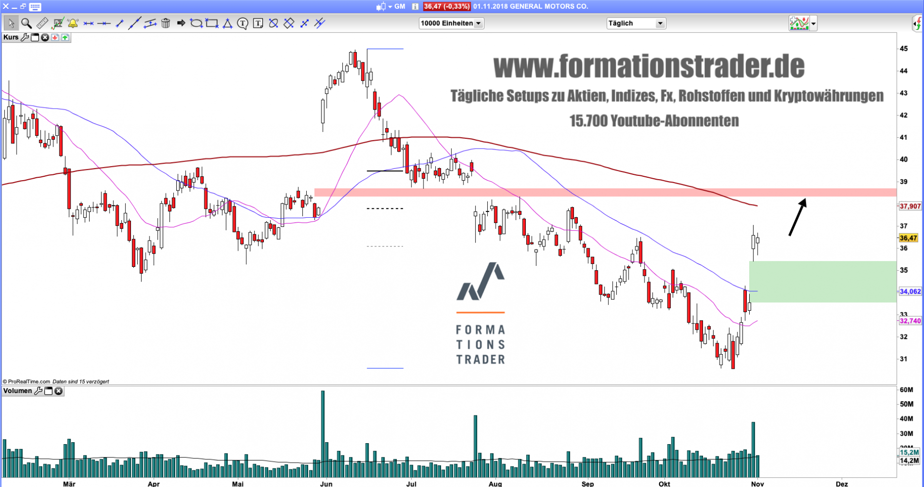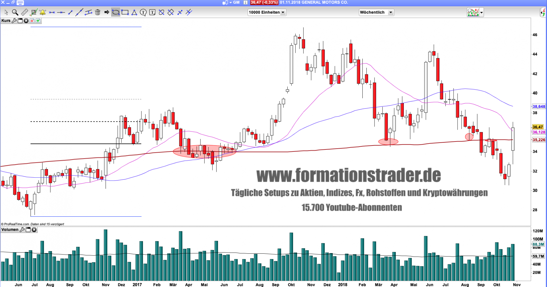 Mit dieser Meldung stieg der Kurs der Aktie mit einer Kurslücke um bis zu 10% und schloss am Mittwoch bei $36.60. Auch am gestrigen Handelstag konnte dieses Niveau in etwa gehalten werden. Im Wochenchart ist die Eroberung der 200-Wochenlinie klar zu erkennen. Falls die Bullen nun mögliche Gewinnmitnahmen gut verkraften und eine Konsolidierung in etwa im Bereich der Mittwochskerze realisieren können, steigt die Wahrscheinlichkeit für eine erneute Aufwärtsbewegung. Zwischen $37.91 und $38.70 befindet sich die nächste Widerstandszone. Diese besteht aus der 200-Tagelinie und der noch offenen Kurslücke im Tageschart. Falls die Bären nun doch zurück ins Spiel kommen sollten, ist das erste Ziel im Bereich von $33.50. Damit wäre die entstandene Kurslücke wieder geschlossen. Weiterhin ist GM auch stark von der allgemeinen Entwicklung im zuletzt stark unter Druck geratenen Automobilsektor abhänig.
