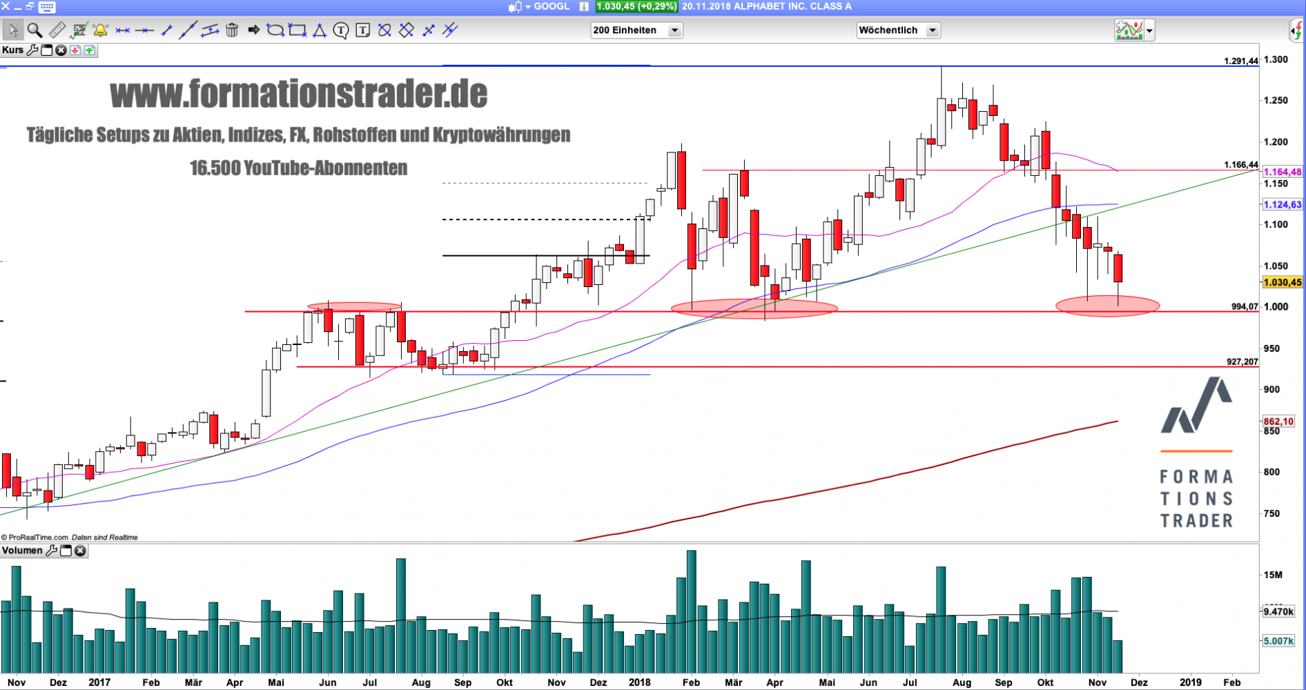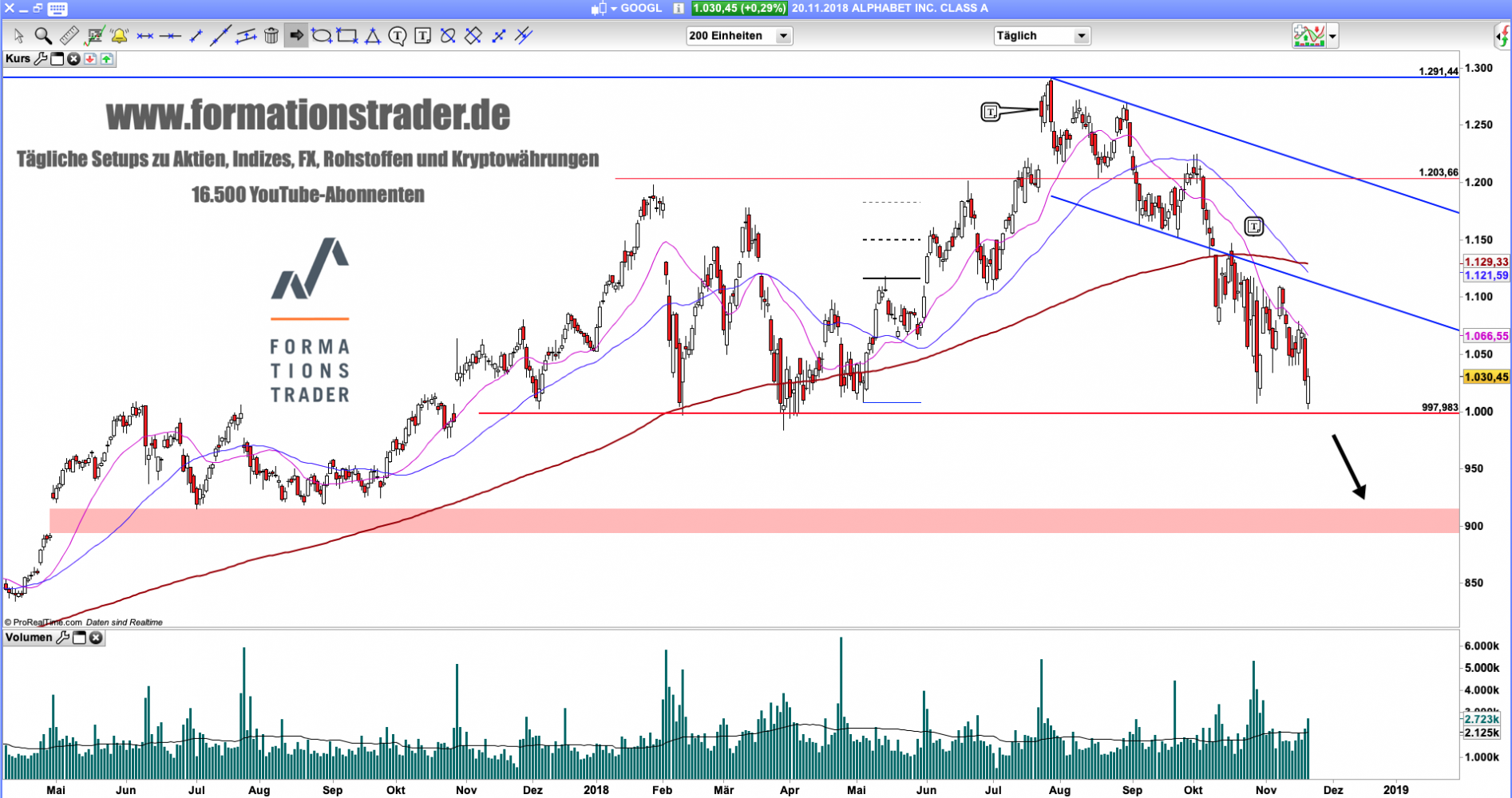 Vielmehr richtet sich der Blick auf die aktuelle Lage im Chart. Im Tageschart ist gut erkennbar, wie der Kurs nun um die psychologisch wichtige $1000-Marke und den horizontalen Widerstand bei $998 kämpft. Damit ist die umgedrehte V-Formation nun abgeschlossen. Nun wird sich zeigen, ob die Bullen eine Stabilisierung im Bereich der $1000 erreichen können und sich ein möglicher Doppelboden ausbildet. Dann richtet sich der Blick zunächst auf die gebrochene 200-Tagelinie bei $1130. Falls der Kurs allerdings liegen bleibt und eine bärische Konsolidierung im genannten Bereich bärisch auflöst, ist das nächste Ziel der Bären die noch offene Kurslücke aus dem Mai 2017. Diese befindet sich zwischen $895 und $920.