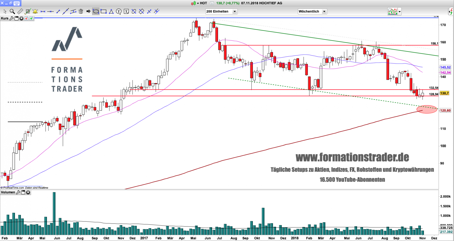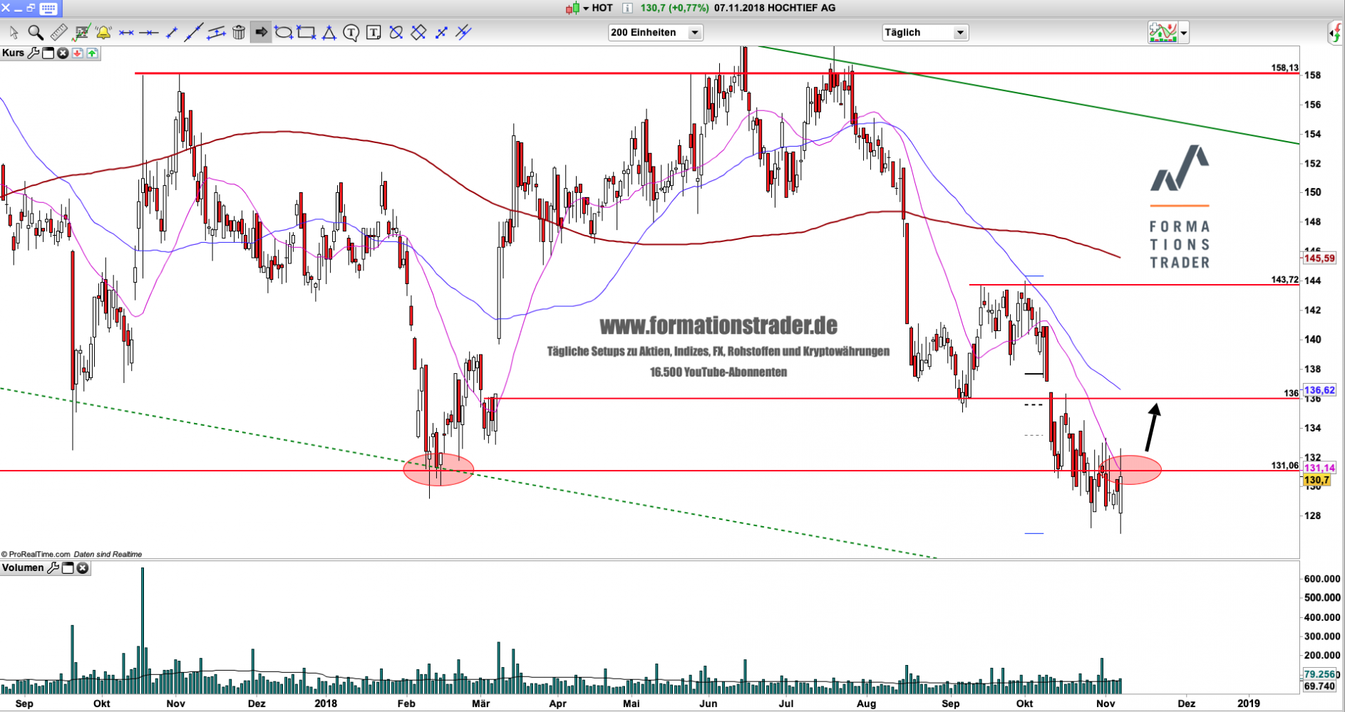 Der Kurs von Hochtief gewann im insgesamt sehr freundlichen Marktumfeld gestern nur 0,77%. Im Tageschart ist der Kampf der Bullen um die wichtige horizontale Begrenzung bei 131,06€ klar erkennbar. Diese Marke konnte zuletzt im Februar verteidigt werden und nun Ende Oktober gebrochen. Echte Dynamik konnten die Bären deshalb jedoch nicht entwickeln. Falls die Bullen den Kampf zeitnah verlieren sollten, richtet sich der Blick auf die nächste Unterstützung bei 125,20€. Dort verläuft das 50%-Retracement der vorangegangenen Aufwärtsbewegung im Wochenchart. Darunter befindet sich bei 120,60€ die 200-Wochenlinie. Falls es den Bullen jedoch gelingt, auch signifikant über der 20-Tagelinie bei 131,14€ zu schließen, ist das nächste Ziel der nächste horizontale Widerstand bei 136€.