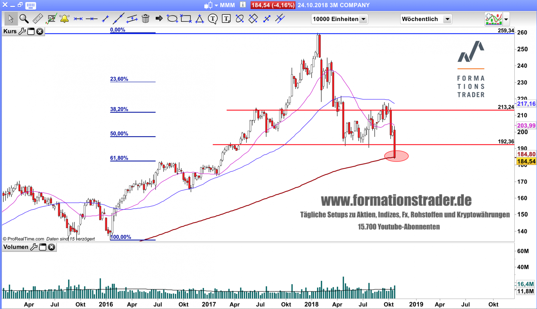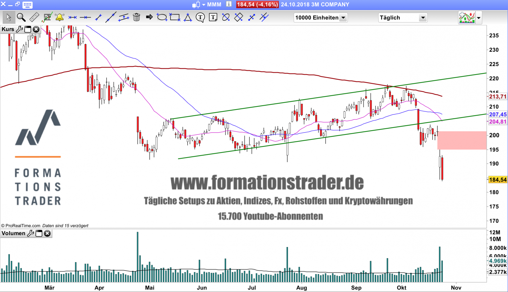 Der US-amerikanische Multi-Technologiekonzern 3M berichtete am Dienstag über seine Unternehmensergebnisse des dritten Quartals 2018. So lag der Gewinn je Aktie bei $2.58 und der Umsatz bei $8.2 Mrd. Die Analysten erwarteten im Konsens einen $2.70 bzw. $8.4 Mrd. Bezogen auf den Vorjahreszeitraum verzeichnete der Umsatz einen Rückgang von 0.2%. Außerdem wurde die Gewinn-Prognose für das Jahr 2018 auf eine Spanne von $9.90 bis $10.00 reduziert. Zuvor belief sich der Ausblick auf $10.20 bis $10.45.