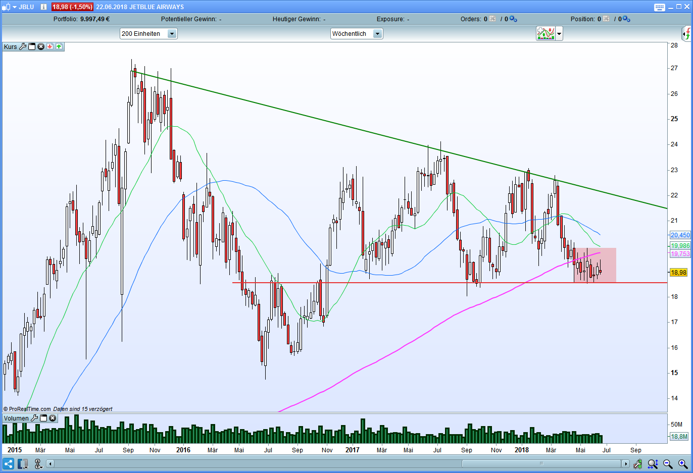 Seit 8 Wochen konsolidiert die Aktie der New Yorker Billigfluggesellschaft oberhalb einer Unterstützung. Diese besteht aus einer horizontalen Linie und dem 61,8% Retracement. Im Wochenchart liegen die gleitenden Durchschnitte über dem Kurs und stellen einen Widerstand dar.