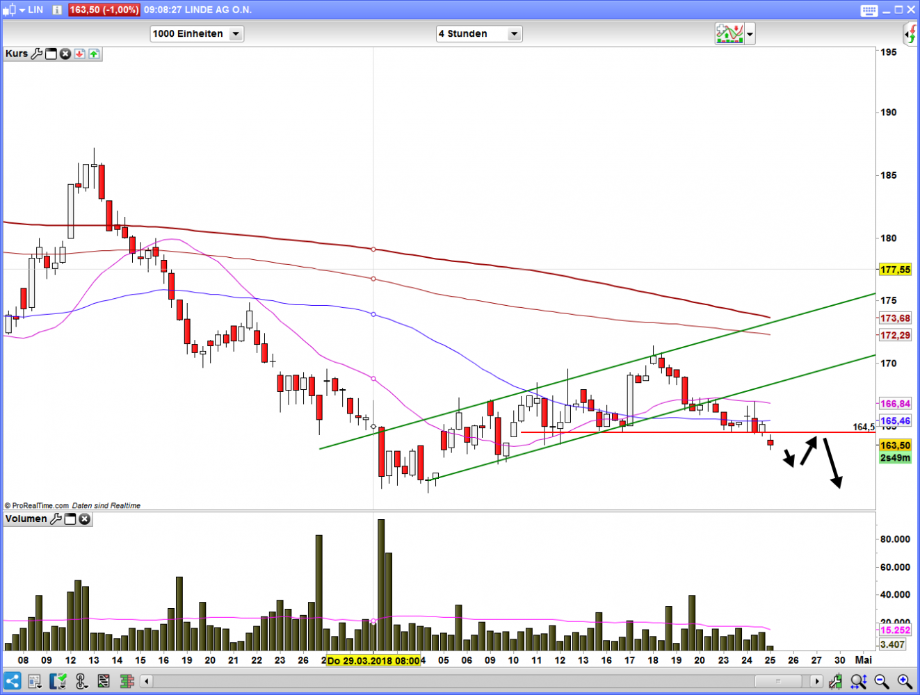 Im 4-Stunden Chart wurde eine Bärenflagge bärisch aufgelöst. Aktuell bietet eine horizontale Unterstützung bei 164,50€ halt. Wird diese aufgegeben, sind Notierungen im Bereich der Jahrestiefs wahrscheinlich.