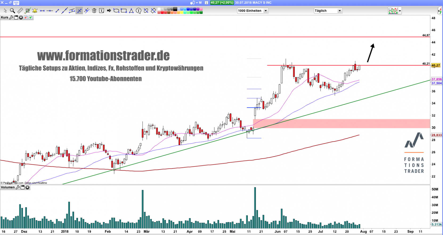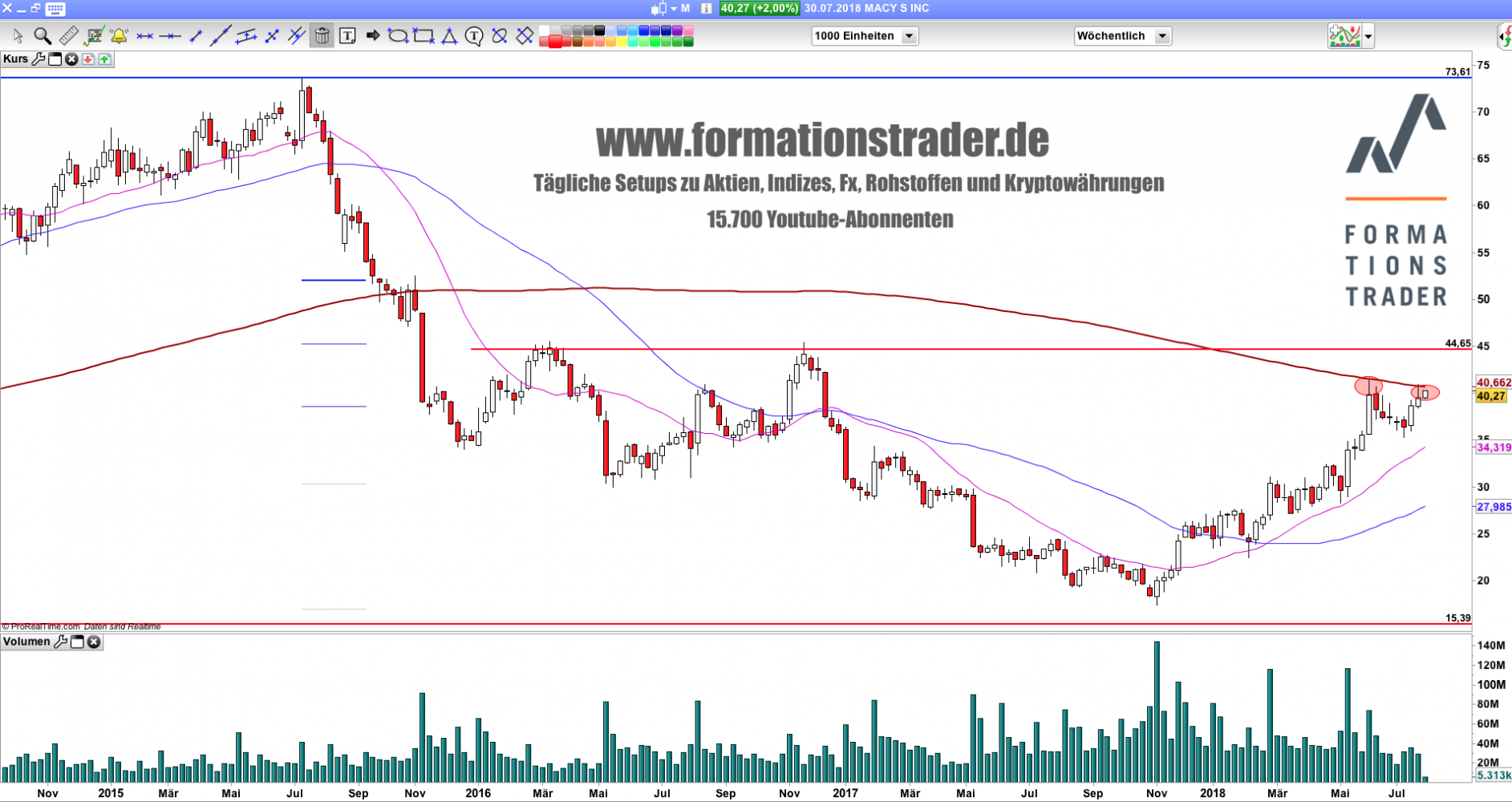 Die #Aktie des größten US-Warenhausbetreibers Macy´s befindet sich seit November 2017 in einem stetigen Aufwärtstrend. Innerhalb sieben Monate konnten Kurse bis an den Bereich der 200-Tagelinie erreicht werden. Dies entspricht einem Wertzuwachs von über 130% im genannten Zeitraum. Im Wochenchart ist seitdem eine Konsolidierung erkennbar, die aktuell auf Schlusskursbasis zwischen $40,21 und $36,12 stattfindet.