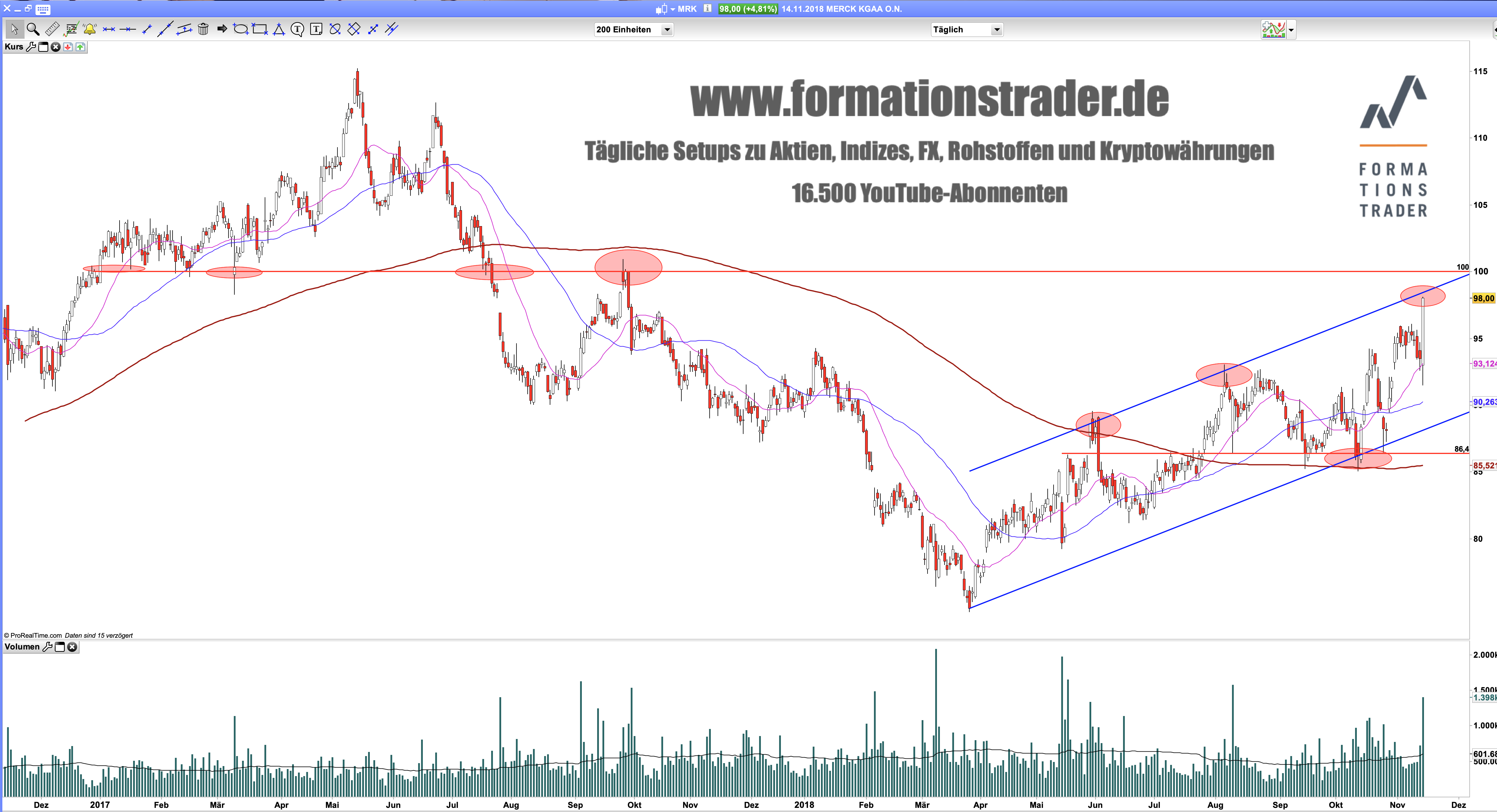 Bei den Anlegern wurden diese Meldungen überwiegend positiv aufgenommen. Mit einem Tagesschlusskurs von 98,00€ schloss der Kurs 4,81% höher. Aus technischer Sicht ist der Kurs der Aktie nun nahe wichtiger Widerstände. Im Tageschart befindet sich die obere Begrenzung des aufwärtsgerichteten Kanals sowie die horizontale Linie bei 100€ in Sichtweite. Diese ist auch mit ihrer psychologischen Wirkung nicht zu vernachlässigen. Erschwerend kommt für die Bullen hinzu, dass bei 99,58€ das 61.8%-Retracement der übergeordneten Abwärtsbewegung im Wochenchart verläuft.