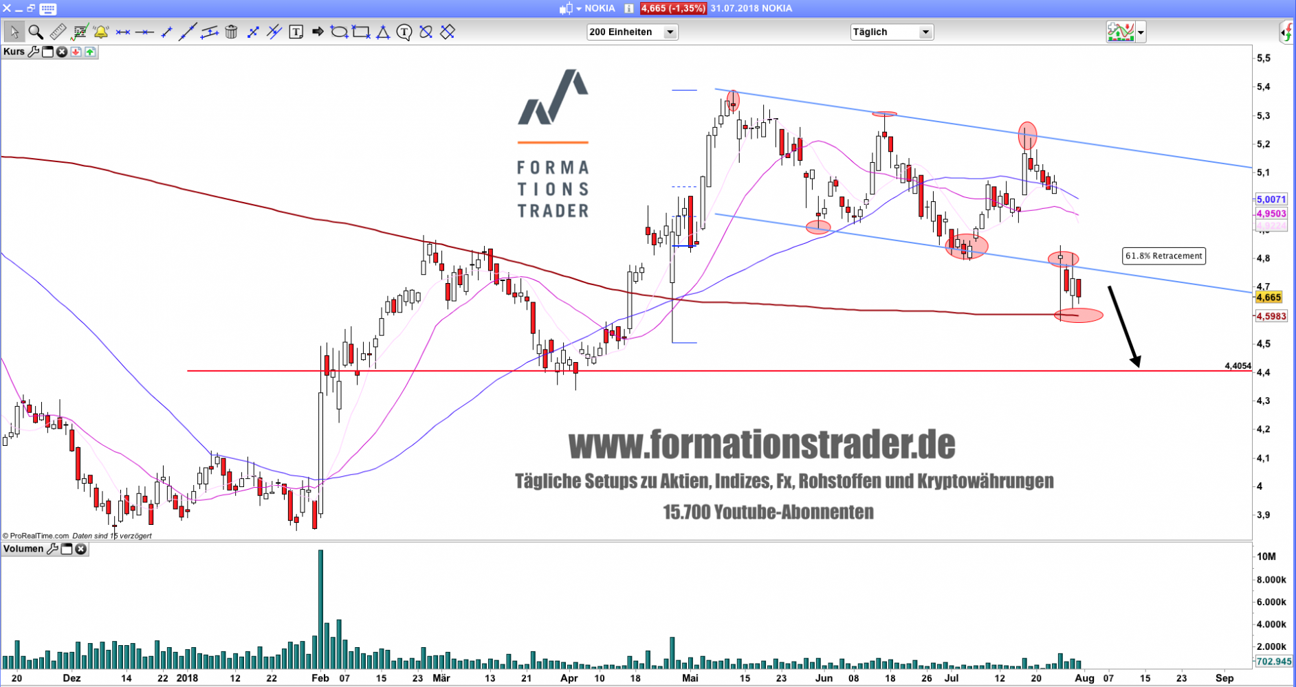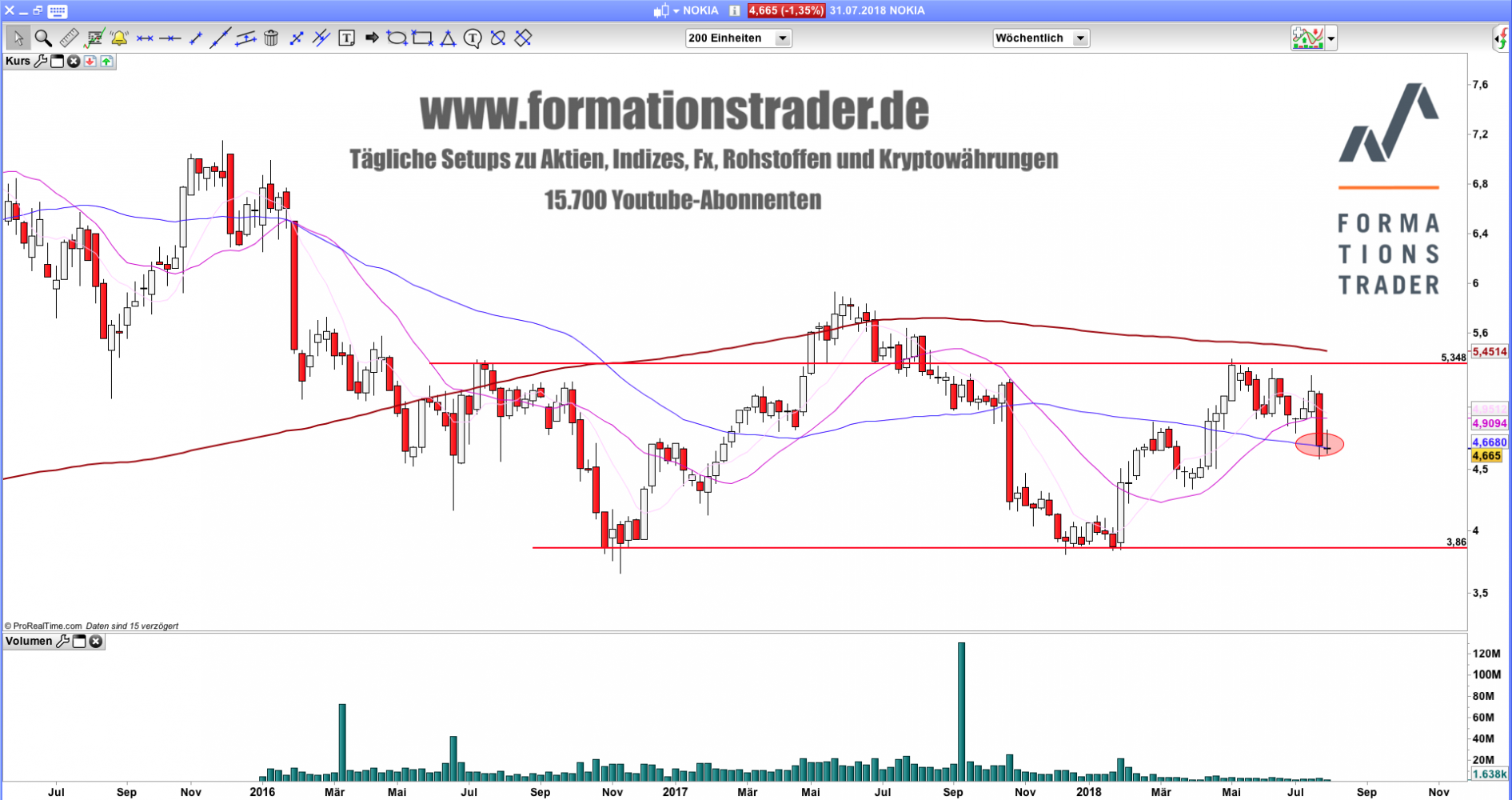 Der Markt scheint davon allerdings nicht wirklich überzeugt zu sein. Nach der Bekanntgabe der Nachrichten wurde die Aktie mit einer Abwärtskurslücke gehandelt und unterschritt in den folgenden Tagen auch das 61.8%-Retracement der letzten Aufwärtsbewegung. Zudem wurde die seit Mai gebildete Bullenflagge bärisch aufgelöst. Dies ist als Zeichen der Schwäche zu werten. Kurzfristig wird der Kurs noch durch die 200-Tagelinie und der 50-Wochenlinie (siehe Wochenchart) unterstützt. Falls diese auch aufgegeben wird, geht der Blick in Richtung der nächsten horizontalen Unterstützung bei rund 4,40€. Falls sich die Bullen doch noch rechtzeitig zurückmelden, gilt es auch den Bereich um die 4,80€ zu überwinden.