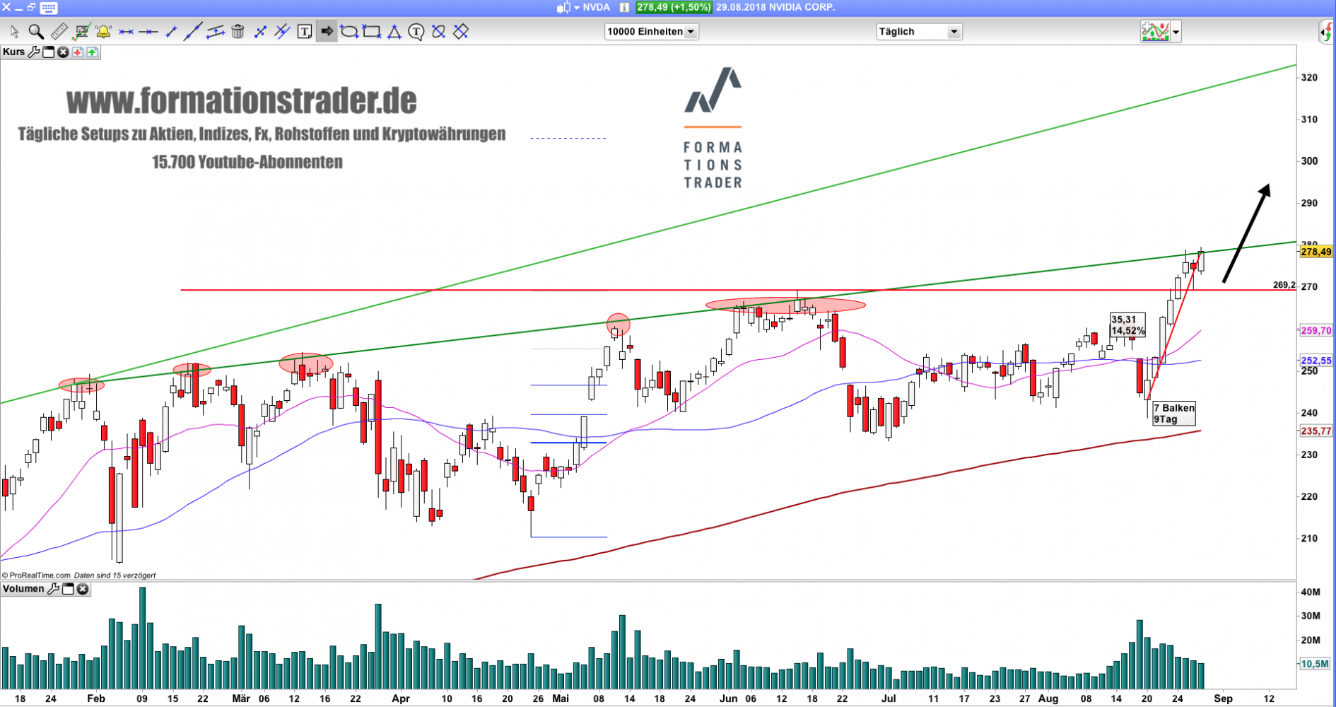 Im Tageschart von Nvidia ist die Beachtung der steigenden Trendbegrenzung deutlich zu erkennen. Diese wurde in den letzten Monaten mehrfach angelaufen und konnte nicht nachhaltig überwunden werden. Am 24.08. wurde das bisherige Allzeithoch bei $269.20 erstmals wieder überwunden. Falls der Kurs nun erneut auf dieser Marke aufsetzt und ein Test für die Bullen positiv verläuft, ergibt sich ein Kurspotenzial in Richtung der psychologisch wichtigen $300-Marke. Falls die Bären deutlicher zurück ins Spiel kommen, richtet sich der Blick auf die 20-Tageslinie bei aktuell rund $259.