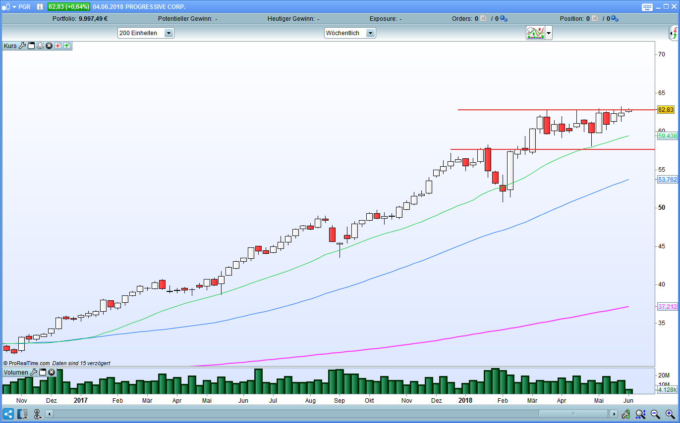Progressiv Corp. hat seinen Börsenwert in 17 Monaten verdoppelt. Seit Mitte März bewegt sich der Kurs seitwärts. Im Wochenchart ist eine enge bullische Konsolidierung zu erkennen. Falls es den Bullen gelingt diese aufzulösen, sind Kurse im Bereich 67$ wahrscheinlicher.