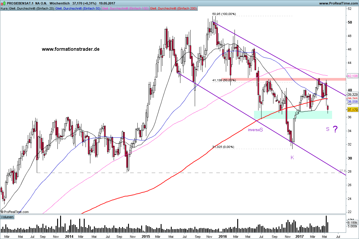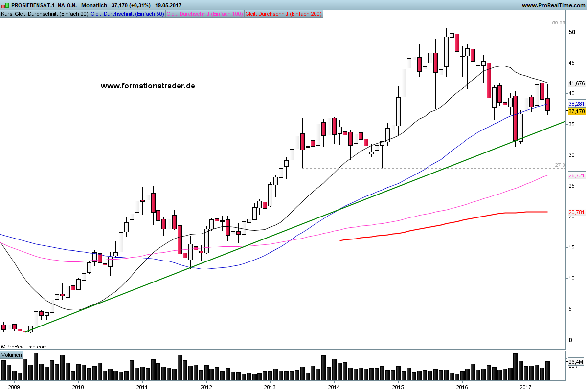 Die ProSiebenSat.1 befindet sich übergeordnet in einem langfristigen Aufwärtstrend und bildete im November 2015 ein Allzeithoch bei 50,95 aus (siehe Monatschart). Darauf folgten mehrere aufeinanderfolgende tiefere Tief- und tiefere Hochpunkte.