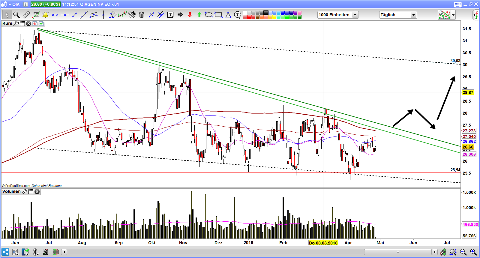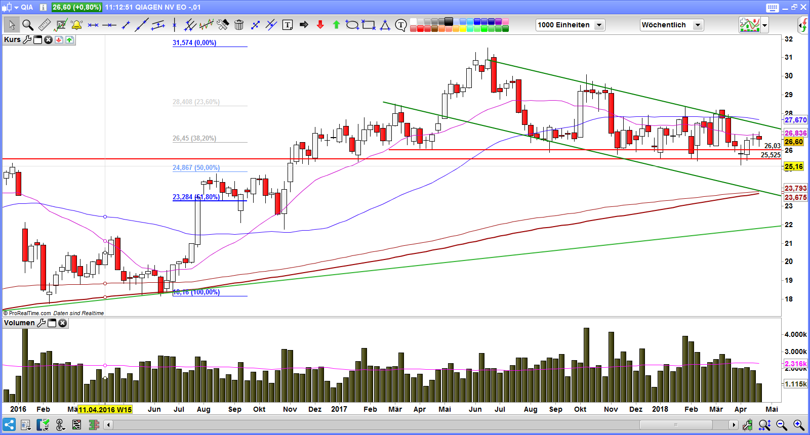 Im Wochenchart befindet sich Qiagen seit Juli 2017 in einer Bullenflagge. Die trendbegrenzende Linie wird durch die 200 Tage Linie verstärkt. Falls es den Bullen gelingt diese Widerstände zu überwinden, wäre eine Bewegung in Richtung 30€ möglich. Die Wahrscheinlichkeit erhöht sich zusätzlich, oberhalb der letzten Hochs im Bereich von 28€.
