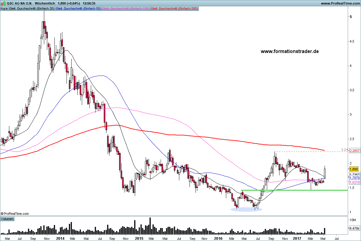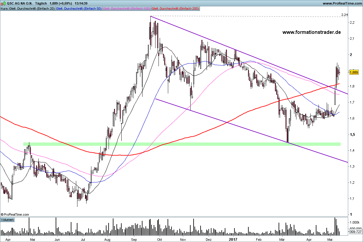 Nach einem starken Abverkauf beginnend von dem Mehrjahreshoch bei 5,14 bildete QSC im März und Juni 2016 im Bereich von 1,10 einen Doppelboden (blaue Elipse). Diese Trendumkehrformation wurde mit Bruch der Nackenlinie (grün eingezeichnet) regelkonform auf der Oberseite aufgelöst. Es folgte eine dynamische Aufwärtsbewegung. Erst bei 2,24 zeigten sich die Bären und verhinderten einen weiteren Anstieg. In der folgenden Konsolidierung wurde mittels Bull-Pullback die Nackenlinie bestätigt und weckte erneutes Kaufinteresse der Bullen.