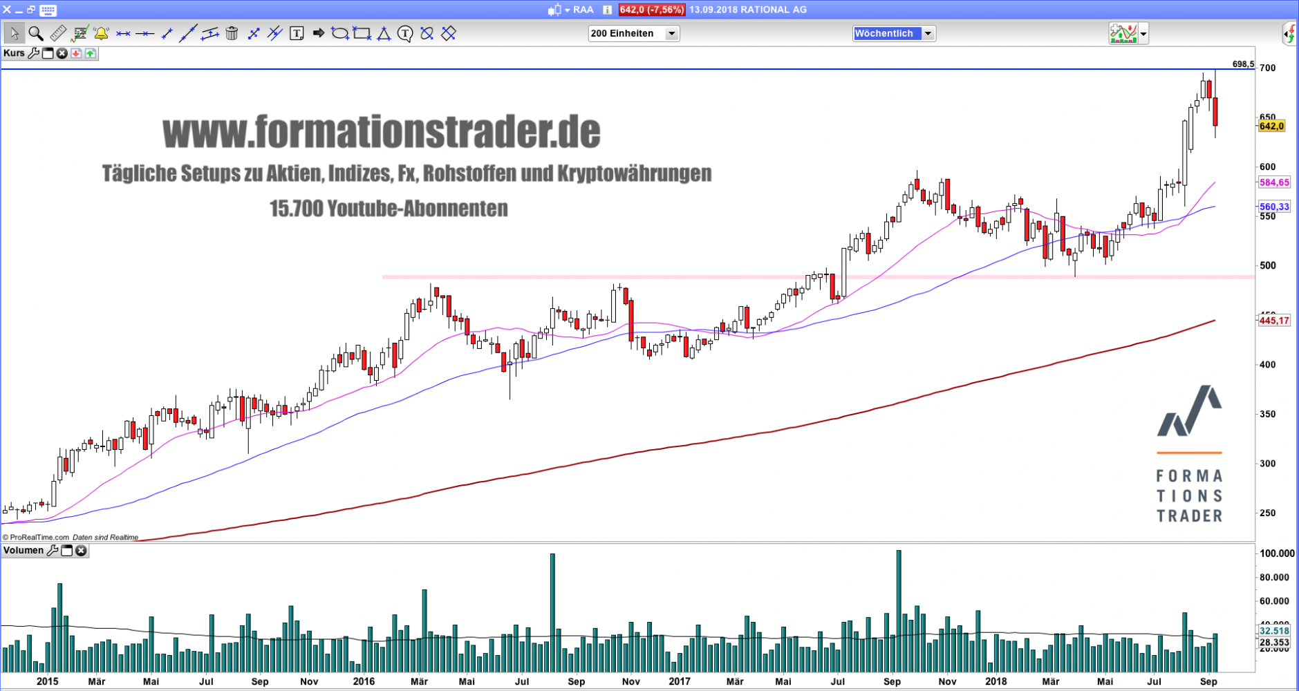 Der Weltmarktführer in Sachen Groß- und Industrieküchen Rational AG war am gestrigen Donnerstag klares Schlusslicht im SDAX. Rund acht Prozent verloren die Papiere per Tageschluss. Grund dafür war eine Herabstufung der LBBW und der Hinweis das die anvisierte EBIT-Marge möglicherweise eine größere Herausforderung werden könnte als bislang angenommen. Insgesamt ist das Unternehmen sehr gut aufgestellt und hob im Laufe dieses Jahres bereits die Prognose für das Geschäftsjahr an. Die Anleger sind grundsätzlich positiv gestimmt. In den vergangenen vier Monaten konnte der Kurs rund 39% zulegen und bildete knapp unterhalb der 700€-Marke ein neues Allzeithoch.