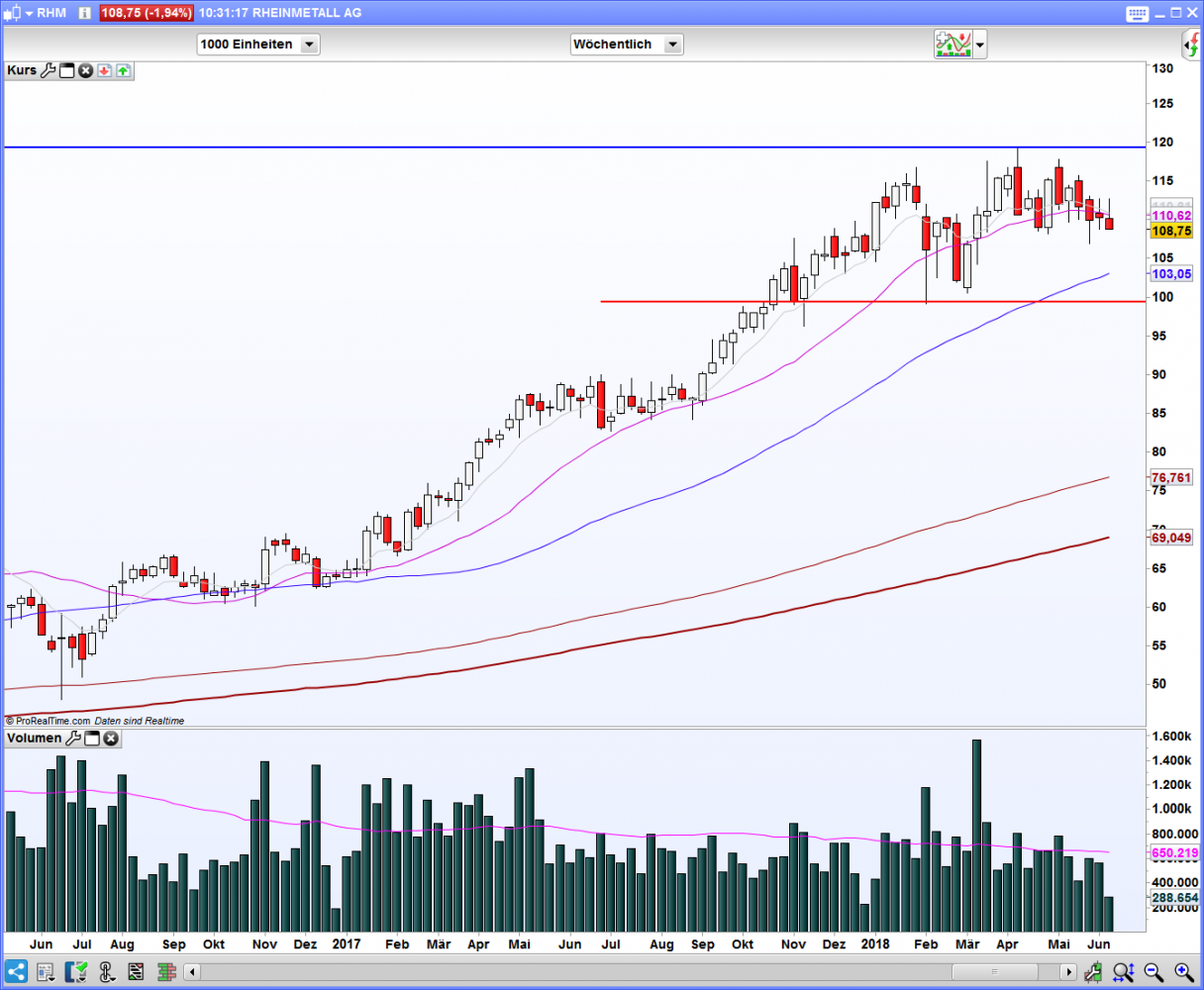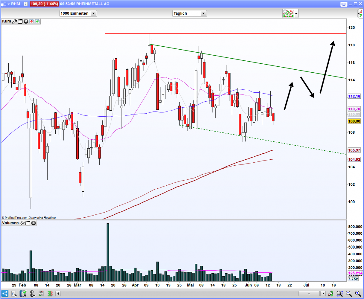 Seit Januar konsolidiert die Aktie der Rheinmetall AG im Bereich des Allzeithochs. Im Tageschart hat sich innerhalb der Konsolidierung eine Bullenflagge gebildet. Falls es den Bullen gelingt diese nach oben aufzulösen, ist ein erneuter Test des Allzeithochs wahrscheinlich.