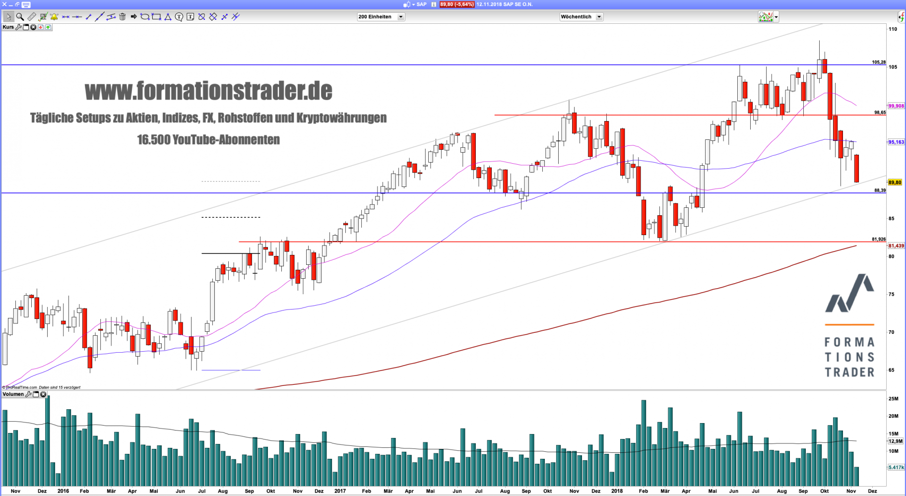 Zusammen mit dem übergeordnet schwachem Gesamtmarkt ging es für SAP per Tagesschluss um 5.6% auf 89,90€ abwärts. Damit wurde auch das 61.8%-Retracement der übergeordneten Aufwärtsbewegung bei 90,90€ gebrochen. Der Kurs steht zudem kurz vor der im Mai gebildeten Kurslücke im Bereich von 88€. Hier verläuft im Wochenchart außerdem eine wichtige horizontale Linie bei 88,39€ sowie die untere Kanalbegrenzung des Aufwärtstrends. Falls die Bären nun doch tiefere Kurse und ein Schließen der Lücke erzwingen können und eine anschließende Konsolidierung keine nachhaltigen Käufe realisieren kann, richtet sich der Blick auf die nächste große Unterstützung bei 81,93€. Hier verläuft eine wichtige horizontale Unterstützung im Wochenchart. Auch die 200-Wochenlinie verläuft in direkter Nähe dazu. Die Bullen sind zunächst gut beraten, nachhaltig Kurse über dem genannten Retracement zu realisieren. Eine erste Aufhellung im Chart ist allerdings erst über der 200-Tagelinie bei aktuell 95,52 zu erwarten.