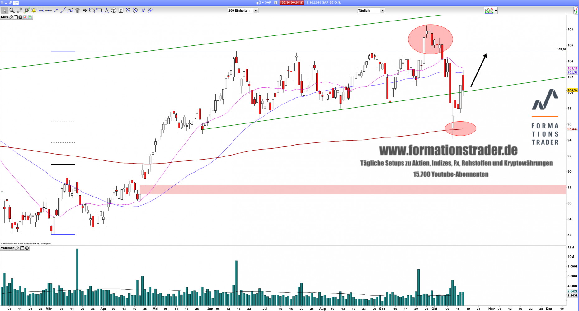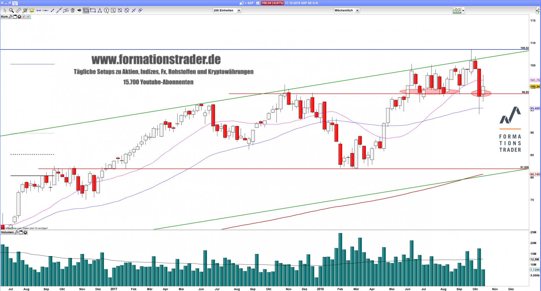 Vorbörslich zeigt sich der Kurs von SAP etwas leichter, knapp unter der 100€-Marke. Im Tageschart ist vor allem die seit Juni andauernde Seitwärtsphase sowie der Fehlausbruch über das ehemalige Allzeithoch bei 105,28€ deutlich zu erkennen. Diese Zone ist nun ein Widerstand für die Bullen, falls die aufsteigende Trendlinie nachhaltig gehalten werden kann und ein Angriff auf neue Allzeithochs versucht werden sollte. Unterstützend wirkt die 200-Tagelinie bei aktuell 95,43€ und die horizontale Linie im Wochenchart bei 98,65€.
