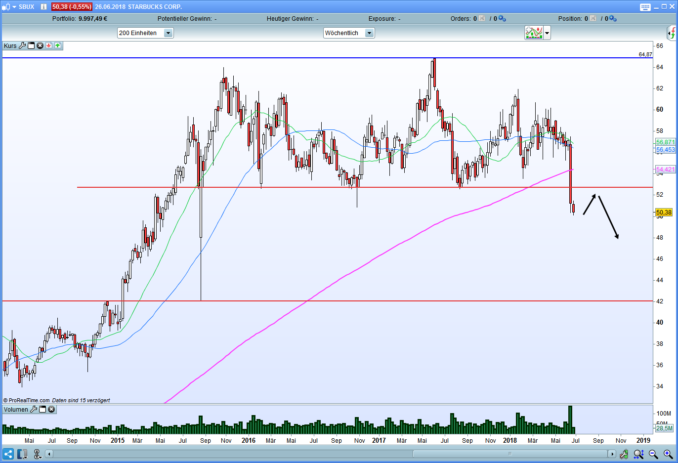 Letzte Woche gab es nach Downgrades von Analysten einen heftigen Ausverkauf von aktuell -13% beim Coffeshop-Betreiber Starbucks. Als Grund für den negativen Konsens wird die geplante Schließung von 150 US-Filialen genannt. Aktuell ist der Markt aus Sicht der Charttechnik überverkauft und kann daher einen Pullback an die ehemalige Ausbruchszone bei $52,50 bis $53,00 durchführen. Von hier aus ist eine erneut bärische Welle in Richtung $50 wahrscheinlicher.
