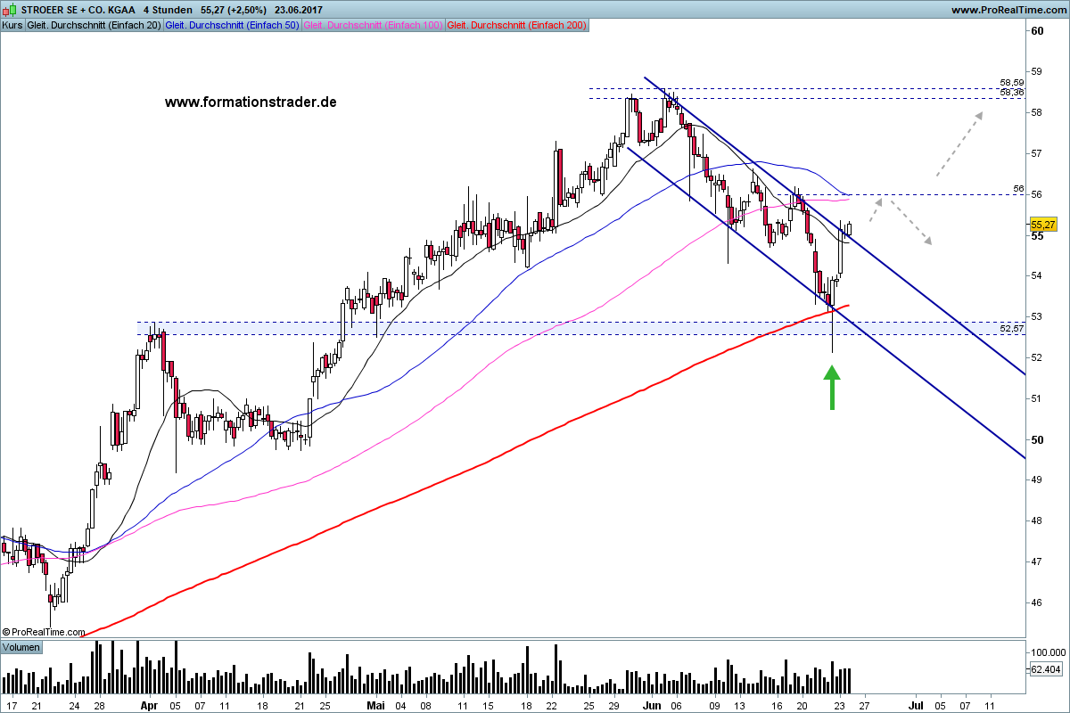 Im 4-Stunden-Chart ist die Korrekturphase der letzten drei Wochen ebenfalls in Form einer bullischen Flagge zu erkennen. Im Tief wurde dabei mit einer Hammerkerze die horizontale Zone bei 52,50 getestet, die ehemals Widerstand war. Diese Zone fand durch die 200 Stundenlinie zusätzlich Unterstützung.