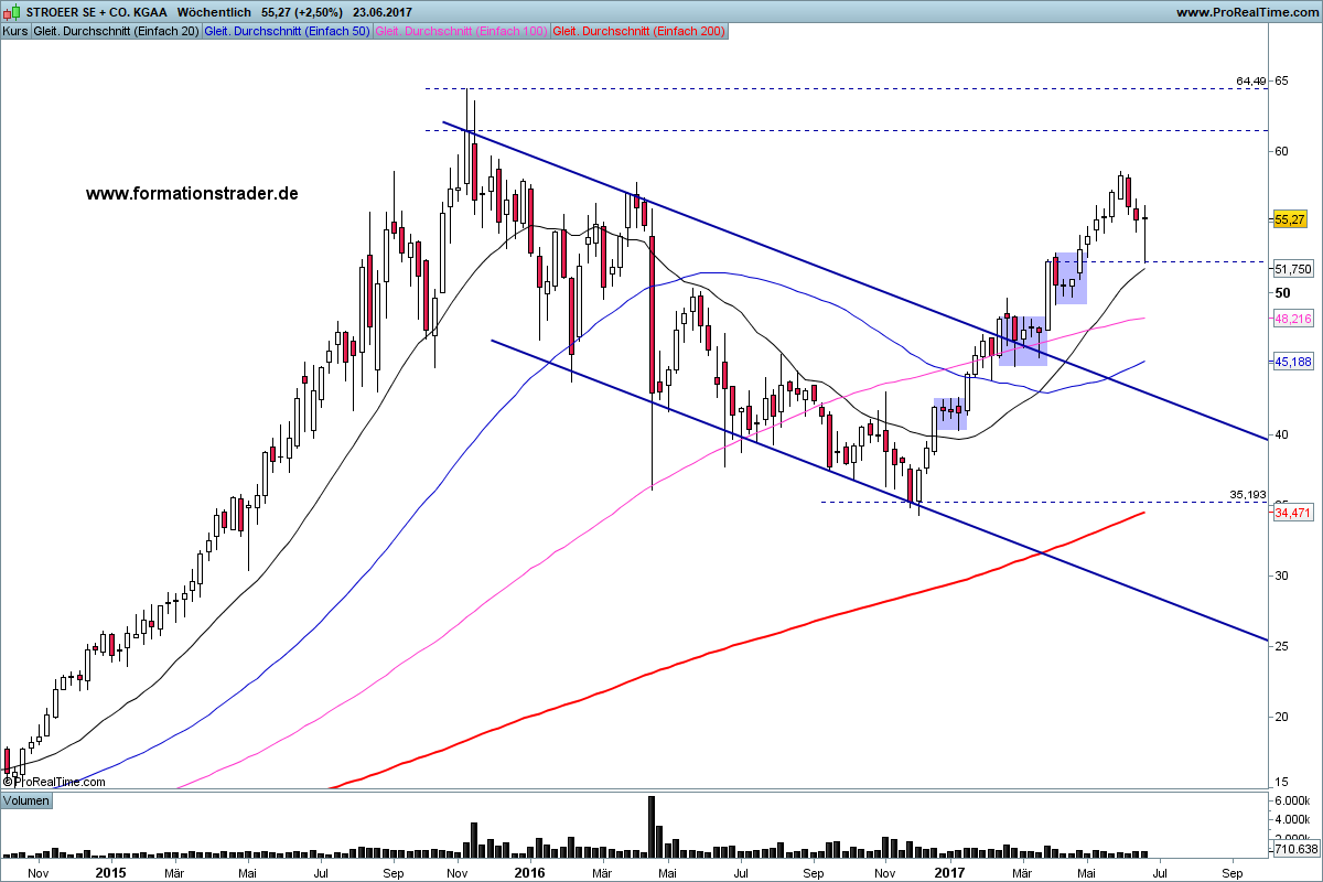 Die Aktie STRÖER bildete Ende 2015 nach einem starken Aufwärtstrend ein Allzeithoch bei 64,49. Es folgte eine einjährige Korrekturphase, bis sich im Bereich von 35 vehement die Käufer zurückmeldeten. Diese sorgten in der Folge für eine gut 70%ige Aufwärtsrally und durchbrachen dabei sogar die obere trendbegrenzende Linie einer großen Bullenflagge.