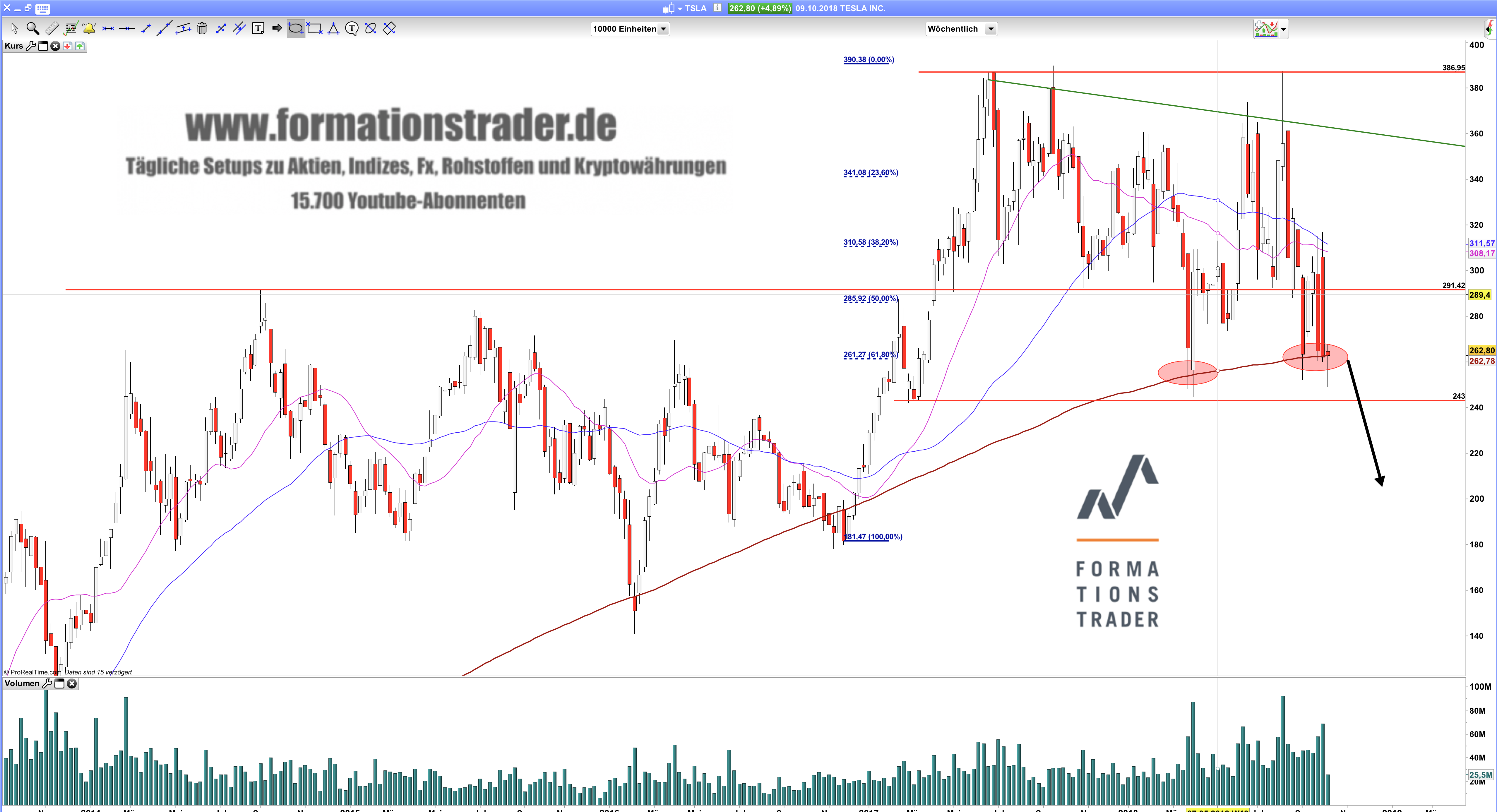 Im Wochenchart zeigt sich abermals die Beachtung der 200-Wochenlinie bei $262.78. In direkter Nähe dazu befindet sich auch das 61.8%-Retracement der vorangegangenen Aufwärtsbewegung. Falls diese Marken von den Bären demnächst bärisch aufgelöst werden, ist das nächste mittelfristige Ziel die psychologisch wichtige $200. Darüber hinaus $181 im Fokus. Die Bullen sollten zunächst Kurse über $314 (200-Tagelinie) realisieren, bevor von einer ersten echten Aufhellung im Chart gesprochen werden kann.