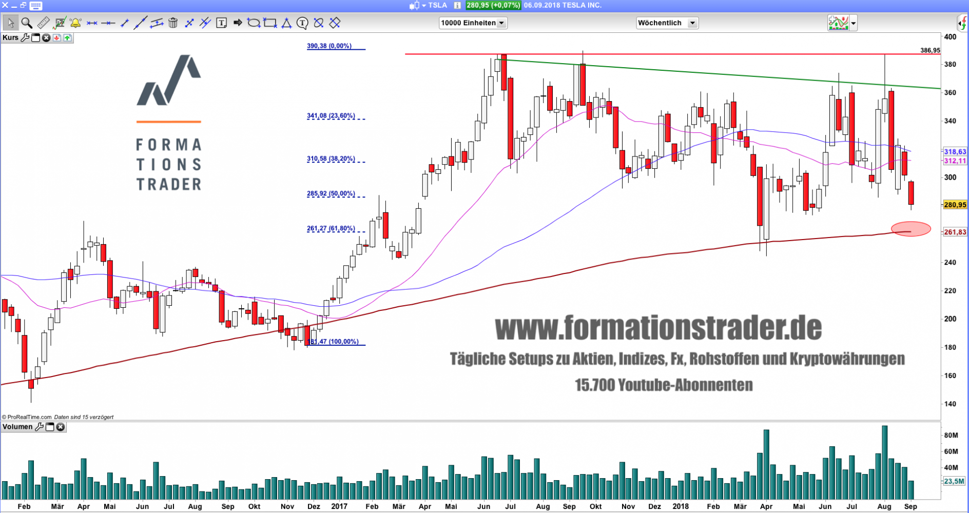 Mit dem gestrigen Schlusskurs ist der Kurs von Tesla einmal mehr im Bereich einer wichtigen Unterstützungszone stehen geblieben. Falls es den Bullen nun gelingt, diese Zone zu verteidigen, richtet sich der Blick zunächst auf die psychologisch wichtige $300-Marke. Diese kann auch als technische Gegenreaktion auf den relativ starken Abverkauf der letzten Tage erfolgen. Falls die Bären jedoch weiter Druck ausüben, ist an der 200-Wochenlinie ($261.83) mit einer stärkeren Unterstützung zu rechnen. Dort befindet sich auch das 61.8%-Retracement der übergeordneten Aufwärtsbewegung.