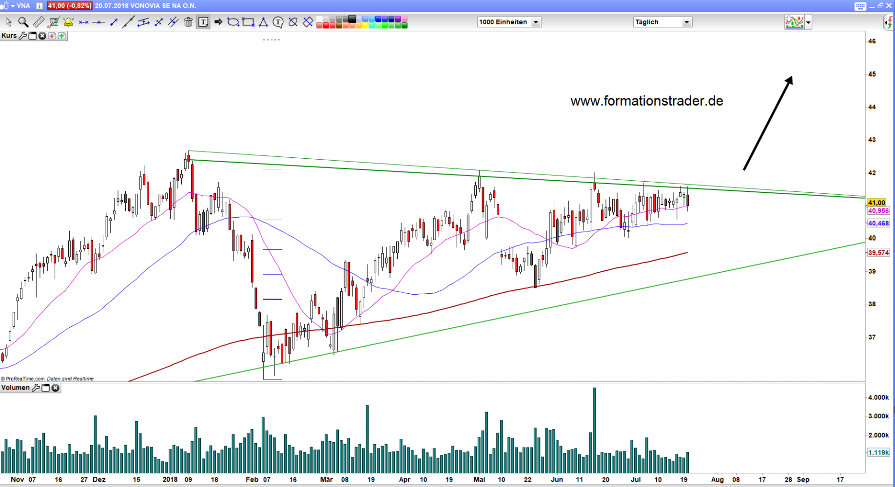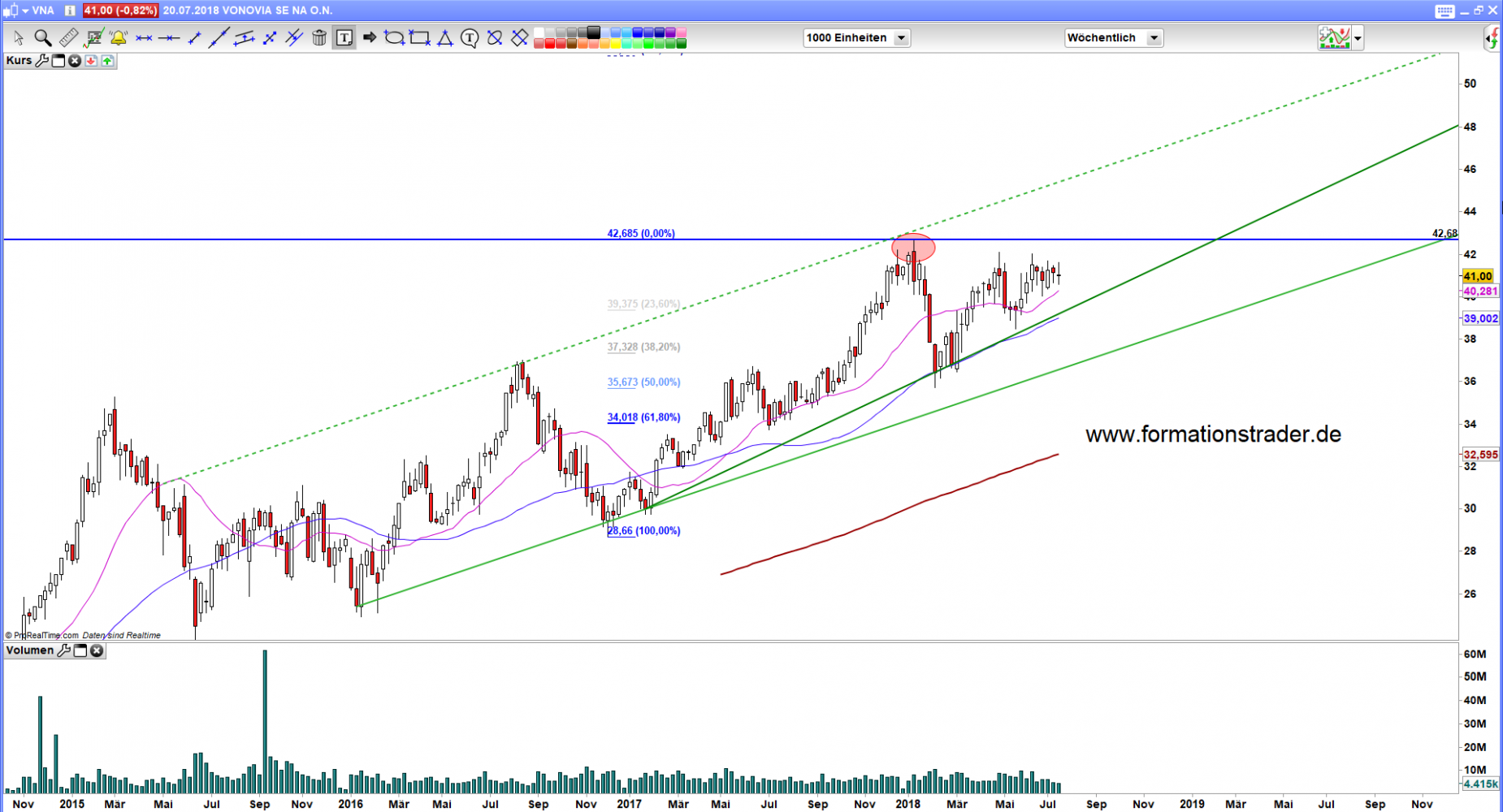 Der Kurs des im #DAX gelistete Wohnungsunternehmen #Vonovia verläuft aktuell sehr nahe eines fallenden Widerstands im Tageschart. Im gesamten letzten Jahr erfreute die #Aktie mit einem Wertzuwachs von rund 48% und konsolidiert diese Bewegung nun schon seit Jahresbeginn 2018. Diese Konsolidierung findet in einer Wimpel-Formation statt, die von einer fallenden und einer steigenden Trendlinie begrenzt wird (siehe Tageschart).