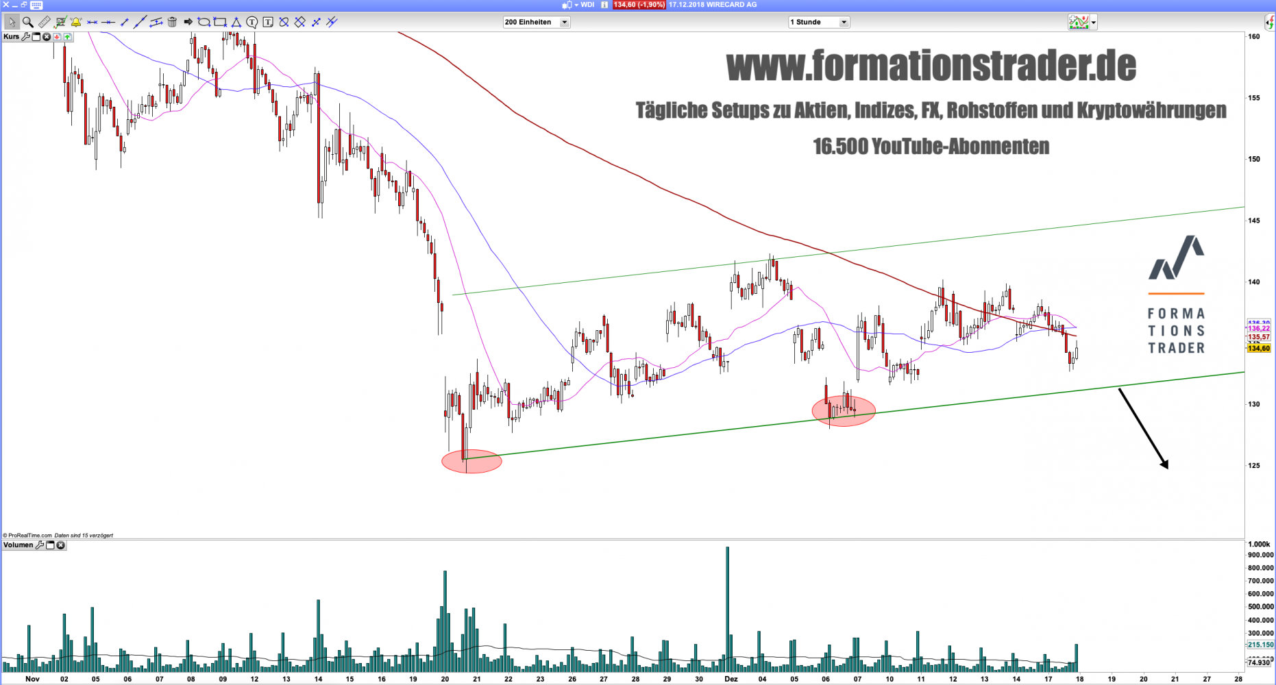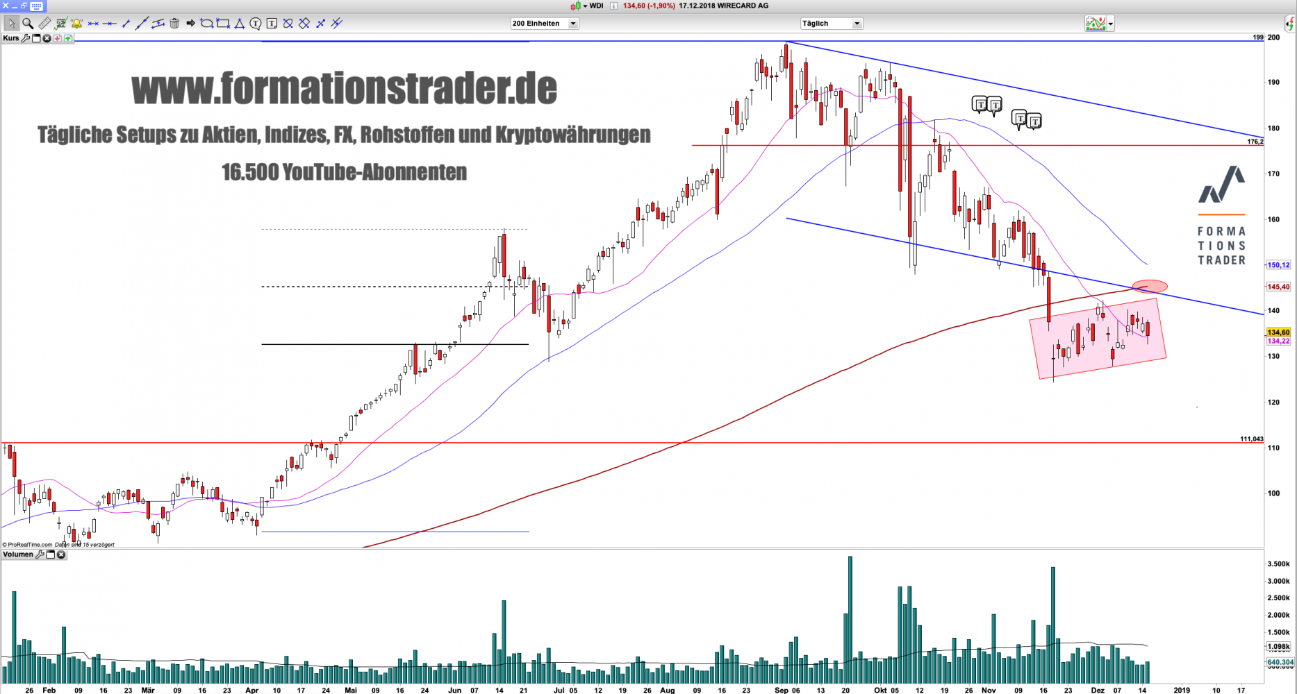 Der Kurs des im DAX gelisteten Finanzdienstleisters Wirecard befindet sich nach wie vor in einer korrektiven Marktphase. Zwischen dem Jahrestief aus dem Februar und dem Allzeithoch bei 199€ im September verteuerten sich die Aktien um rund 133%. Mit dem Rückgang unter die Marke von 130€ Ende November wurde dann zeitweise auch das 61.8%-Retracement der vorangegangenen Aufwärtsbewegung unterschritten.