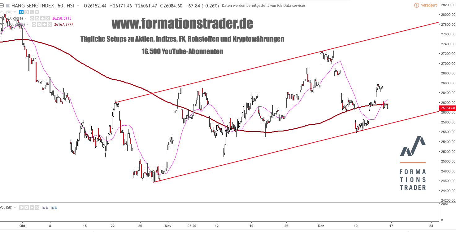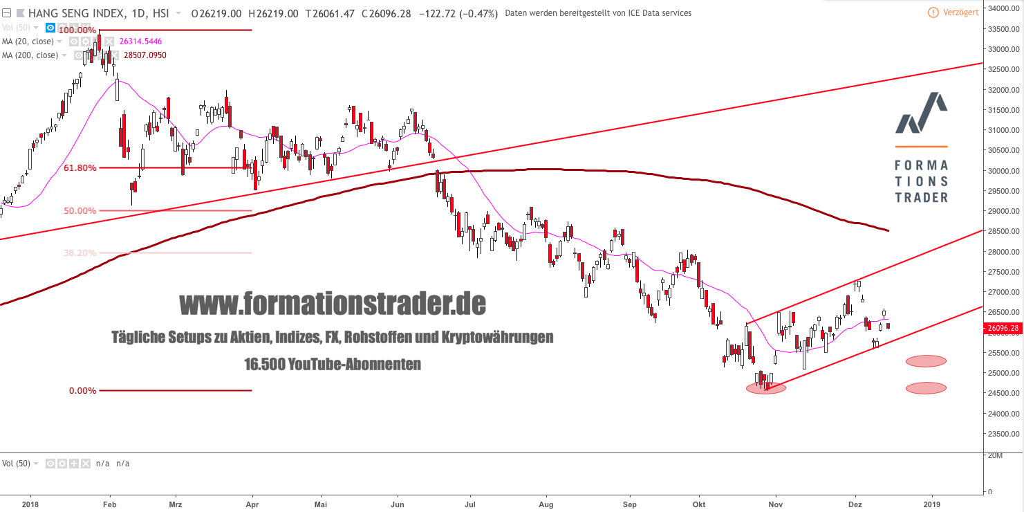 Seit Januar gab er über 8800 Punkte nach und fiel damit in der Spitze um rund 26%. Seit November wird diese Abwärtsbewegung nun in einer Bärenflagge konsolidiert (siehe Stundenchart). Falls die Bärenflagge in den nächsten Tagen gen Süden aufgelöst werden sollte, droht ein erneuter Ausverkauf asiatischer Aktien. Dieser Bruch hat als erstes Ziel die 200-Wochenlinie bei 25.215 und anschließend die psychologisch wichtige 25.000-Punktemarke Falls dann weiterer Abgabedruck aufkommen sollte, ist ein Angriff der Bären darüber hinaus bis in den Bereich um 24.500 bis 24.600 möglich. Dort befinden sich das Jahrestief aus dem November.