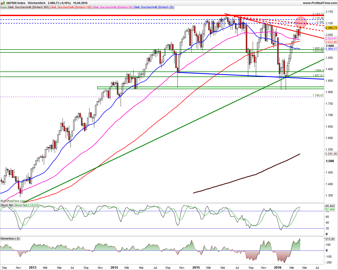 Aber: Ab der kommenden Woche werden dem Leitindex aufgrund einer sehr engen Ansammlung von vielen Widerständen erhebliche Steine in den Weg gelegt. Zwar konnte der S&P 500 seine auf Schlusskursbasis verlaufende rote Abwärtstrendlinie überwinden, zieht man jedoch diese Trendlinie anhand verschiedener Wochenhochs, befindet sich bei 2.081 und 2.100 Punkten ein möglicher Widerstand der auf Schlusskursbasis im Tageschart bestätigt und zudem durch verschiedene horizontale Widerstände verstärkt wird. Ein schneller Durchbruch würde den Bullen sehr viel Kraft kosten, so dass ein nachhaltiger Ausbruch auf ein neues Allzeithoch (>2.135 Punkte) im ersten Anlauf eher unwahrscheinlich zu bewerten ist. Eher wahrscheinlich ist, dass der Leitindex nochmals eine Korrektur in Richtung 2.000 Punkte oder zumindest eine zeitlich ausgedehnte mehrwöchige Seitwärtskonsolidierung entlang des Widerstandsbereichs ausbilden.
