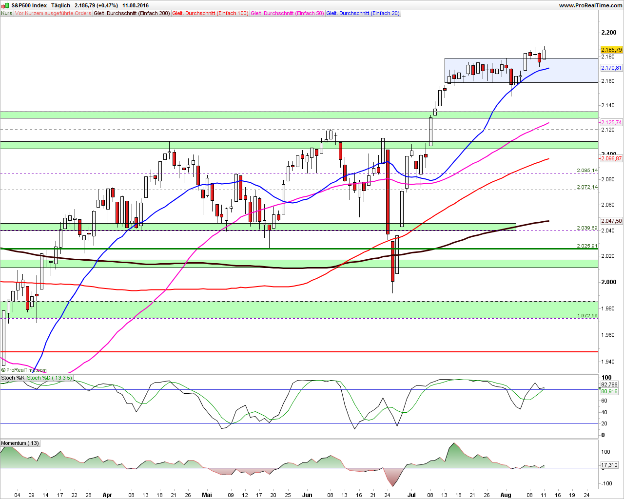 2016-August-12 US-Märkte & Indizes Tagesausgabe "DAX und S&P500 – S&P 500 mit neuem Allzeithoch"