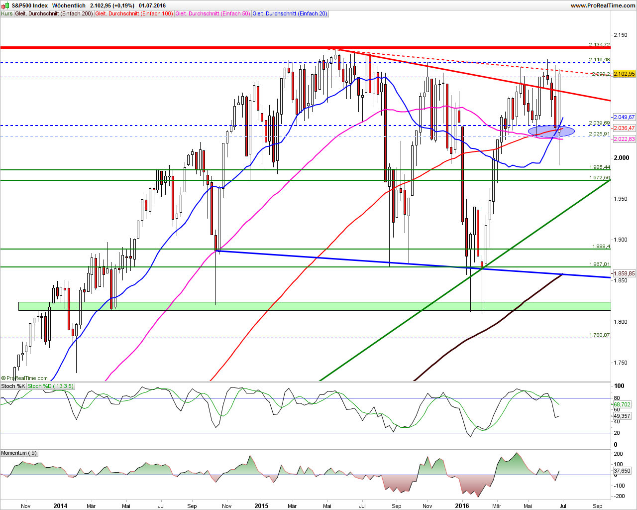 S&P 500 Tageschart (kurzfristig): Auf Tagesbasis zeigt sich die beeindruckende Volatilität der vergangenen zwei Wochen, als Ergebnis der Brexit-Entscheidung. Mit dem Wochenschluss bei 2.102 Punkten befindet sich der Leitindex auf dem Niveau vor der Brexit-Entscheidung. Der Unterschied dabei ist, dass durch die in der Zwischenzeit stattgefundene knapp 6%ige Schwankung ein Großteil der Marktteilnehmer aus Ihren Positionen heraus gespült wurden. Eine solche Marktbereinigung ist erfahrungsgemäß positiv zu bewerten, da diese Marktteilnehmer nur langsam wieder in den Markt zurückfinden und so für weiter steigende Nachfrage und steigende Kurse sorgen.