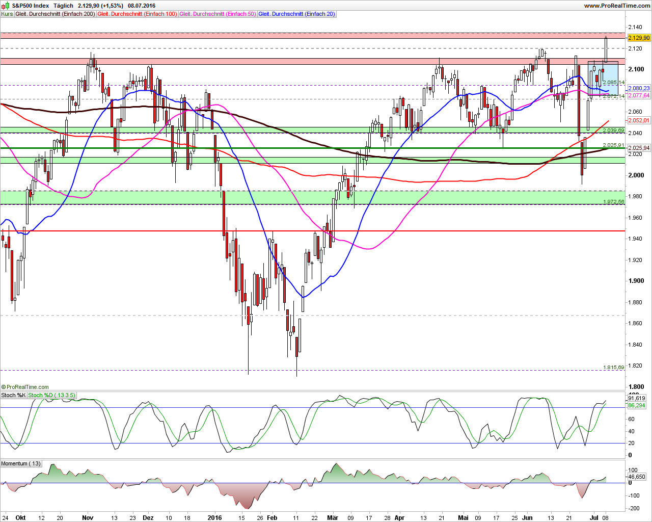 Bei den Indikatoren befinden sich die Stochastik und das Momentum im Kaufmodus. Beide unterstützen einen möglichen Ausbruch über den wichtigen 2.135er Widerstand. Solange der S&P 500 die 1.990er Marke nicht mehr unterschreitet, wäre selbst ein nochmaliges Scheitern der Bullen an der 2.135 unproblematisch. Daher ist oberhalb der 1.990er Marke eine Fortsetzung des langfristigen Aufwärtstrends nur eine Frage der Zeit.