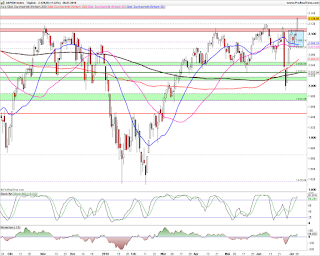 Vorsicht: Sollte der S&P 500 die 2.135er Marke mit einer größeren Kurslücke zur heutigen Eröffnung überspringen, besteht die Gefahr, dass der S&P 500 im Anschluss abverkauft und diese Kurslücke geschlossen wird. Denn um einen solch wichtigen Widerstand, wie es derzeit an der 2.135er Marke der Fall ist, muss weiterhin mit einer heftigen Gegenwehr der Bären gerechnet werden.